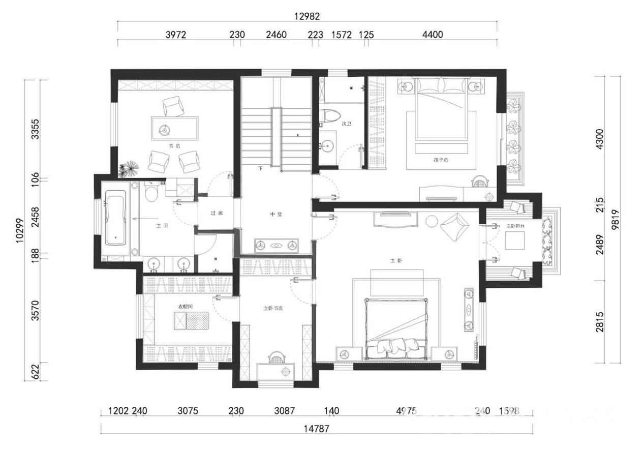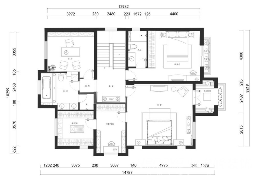业主夫妇是70后,均为公司高管,平日工作繁忙,非常喜欢乡村美式给与内心的平静与惬意的放松感。设计中,休闲区与娱乐区均使用大面积的明快色彩,还有贴近自然的文化石砖,力求表现出一种遵守自然、朴素的室内空间气氛。而工作区域书房则用深色为主色调,深色调可以平静内心,在有办公需求时能帮助人们尽快进入工作状态。