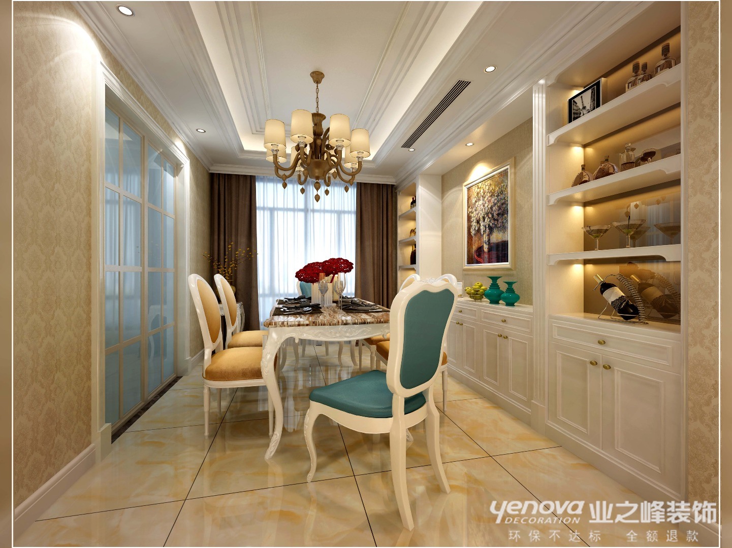 餐厅在满足正常的使用的同时,增设了一组酒柜,在装饰的同时,缓解空间内的储物压力。在整体造型上与客厅部分保持统一。