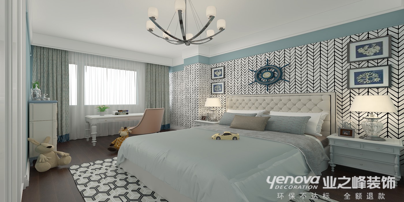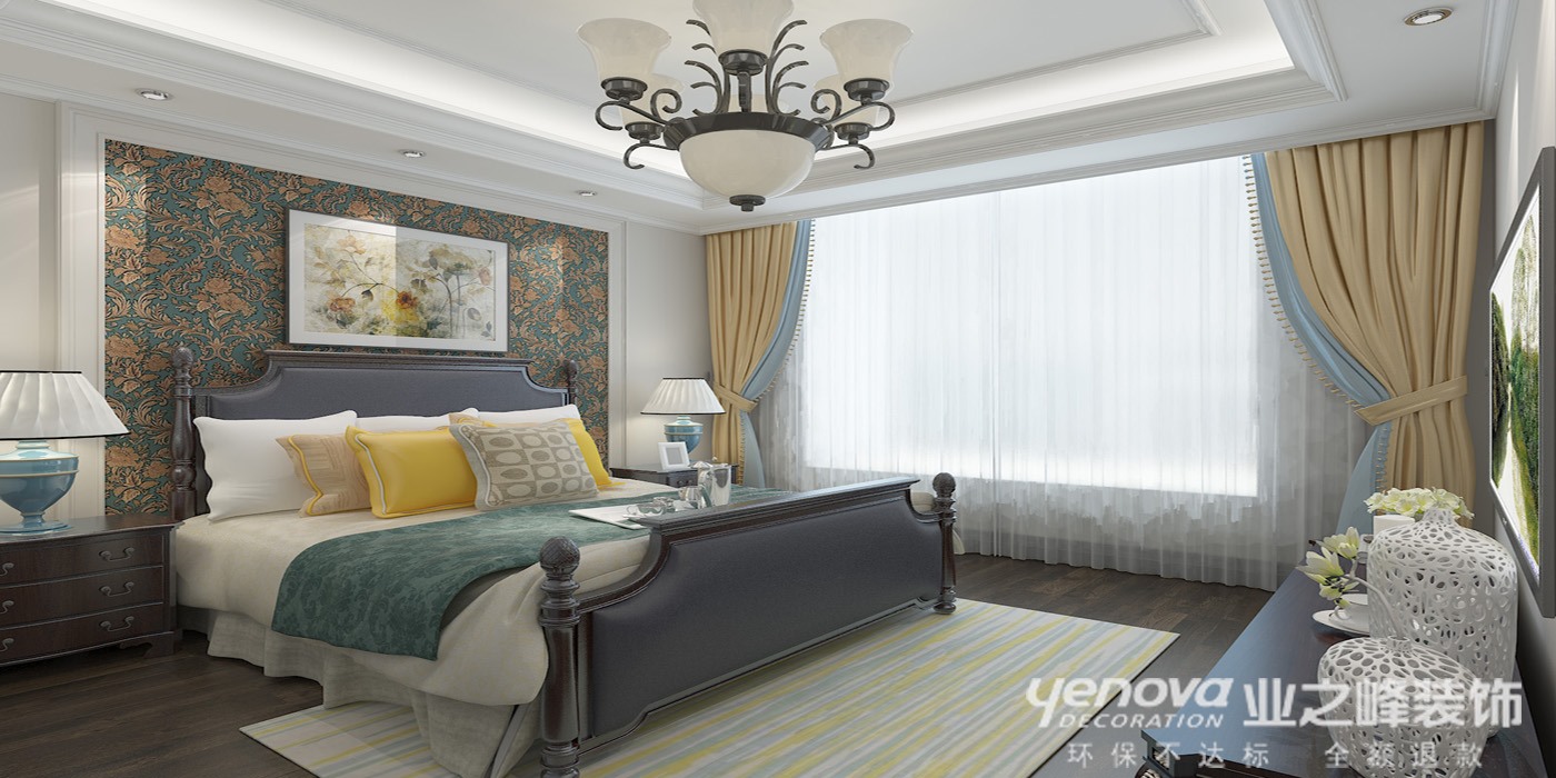 美国是一个崇尚自由的国家,这也造就了其自在、随意的不羁生活方式,没有太多造作的修饰与约束,不经意中也成就了另外一种休闲式的浪漫,而美国的文化又是一个移植文化为主导的脉络,它有着欧罗巴的奢侈与贵气,但又结合了美洲大陆这块水土的不羁,这样结合的结果是剔除了许多羁绊,但又能找寻文化根基的新的怀旧、贵气加大气而又不失自在与随意的风格。美式家居的卧室布置较为温馨,作为主人的私密空间,主要以功能性和实用舒适为考虑的重点,一般的卧室不设顶灯,多用温馨柔软的成套布艺来装点,同时在软装和用色上非常统一。现代美式多用非炫目灯光,且尽量做到只见光不见灯的效果。