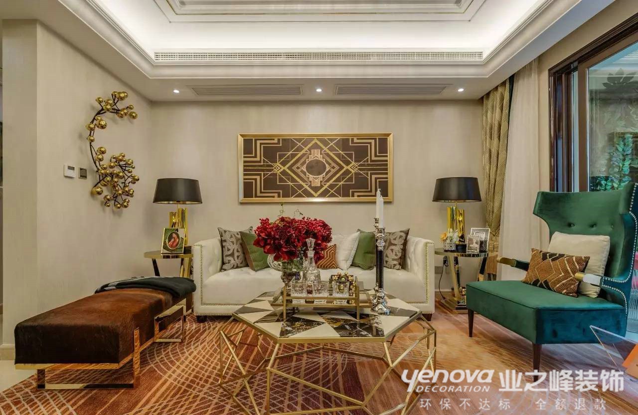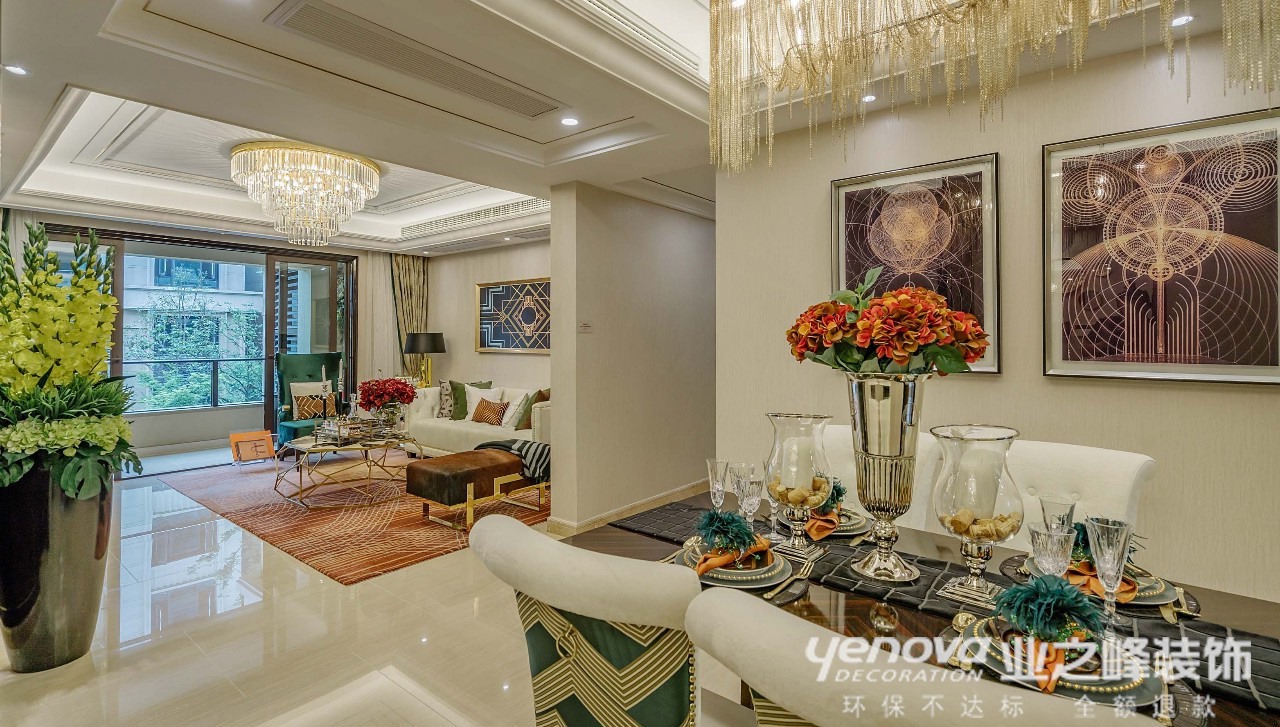 在客餐厅宽敞明亮的空间内,墙面甚至都没有过多的硬装,因为从顶面采用跌级灯带吊顶,细节上用铜条收边,更有空间感,而软装色彩样式比较考究,所以墙面不能做得过于复杂。