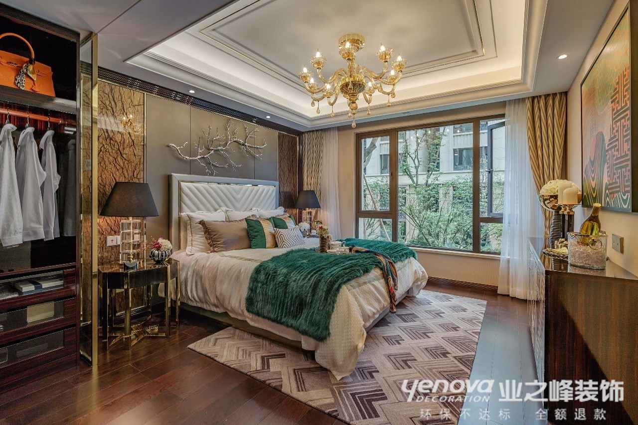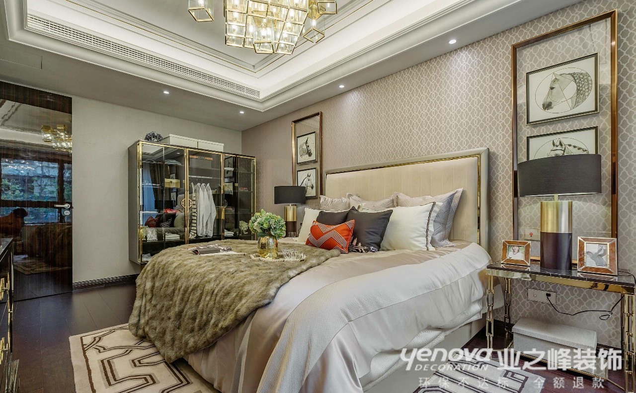 卧室的吊顶用PU线条和铜条进行细节上的丰富,地面用深色的木地板成为整个空间的重色去压住整个色调,墙面用素色的壁纸和带纹路的壁纸进行搭配,采用有质感的家具,比如金属和玻璃,软包和挂饰,每一个地方都有他的亮点。