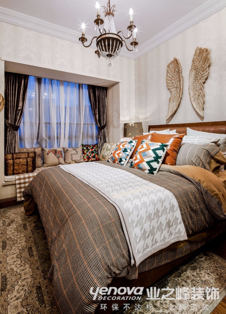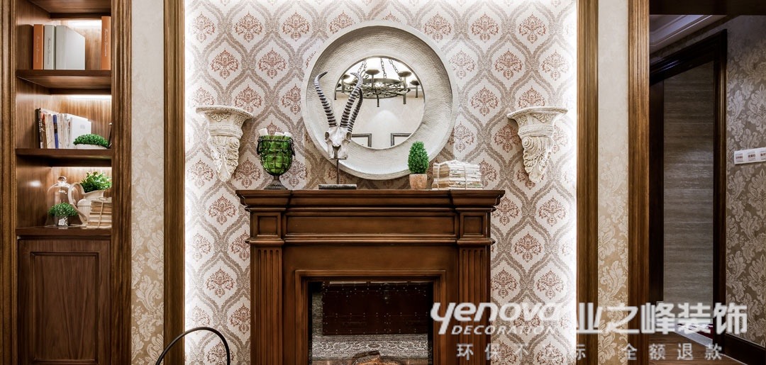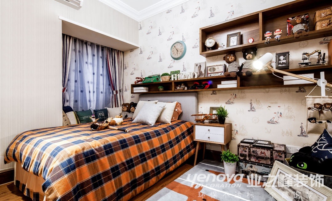 在空间硬装上其实并不复杂,相反,只在顶面用简单的PU线条把顶面和墙面立体感分割开,甚至在次卧的墙面,仅仅是用带样式的壁纸和周围的素色壁纸做出区分,主卧则是全房壁纸是比较统一的,主卧相对来说比较规整,所以美式厚重的家具质感,搭配色彩相对有跳跃性的橘色和绿色撞色色的纹路色彩,次卧则用装饰性实木隔板进行点缀,使得卧室空间不显得凌乱。