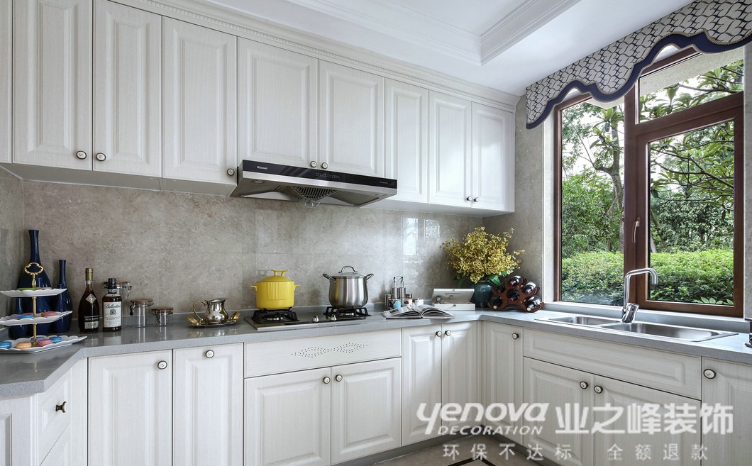 厨房最主要的就是干净整洁,采用优雅的白色,沉稳的灰色,电器隐藏在吊柜里,视线范围中不会有太多杂物。