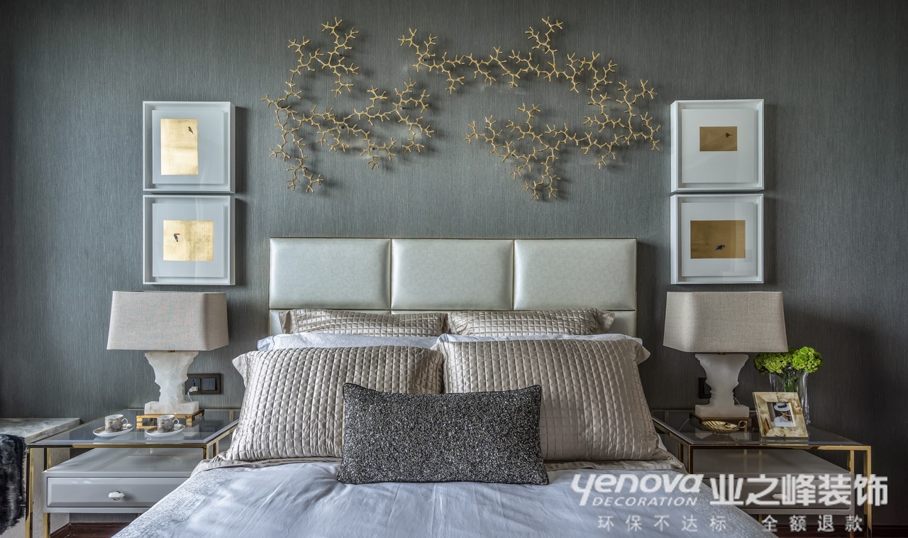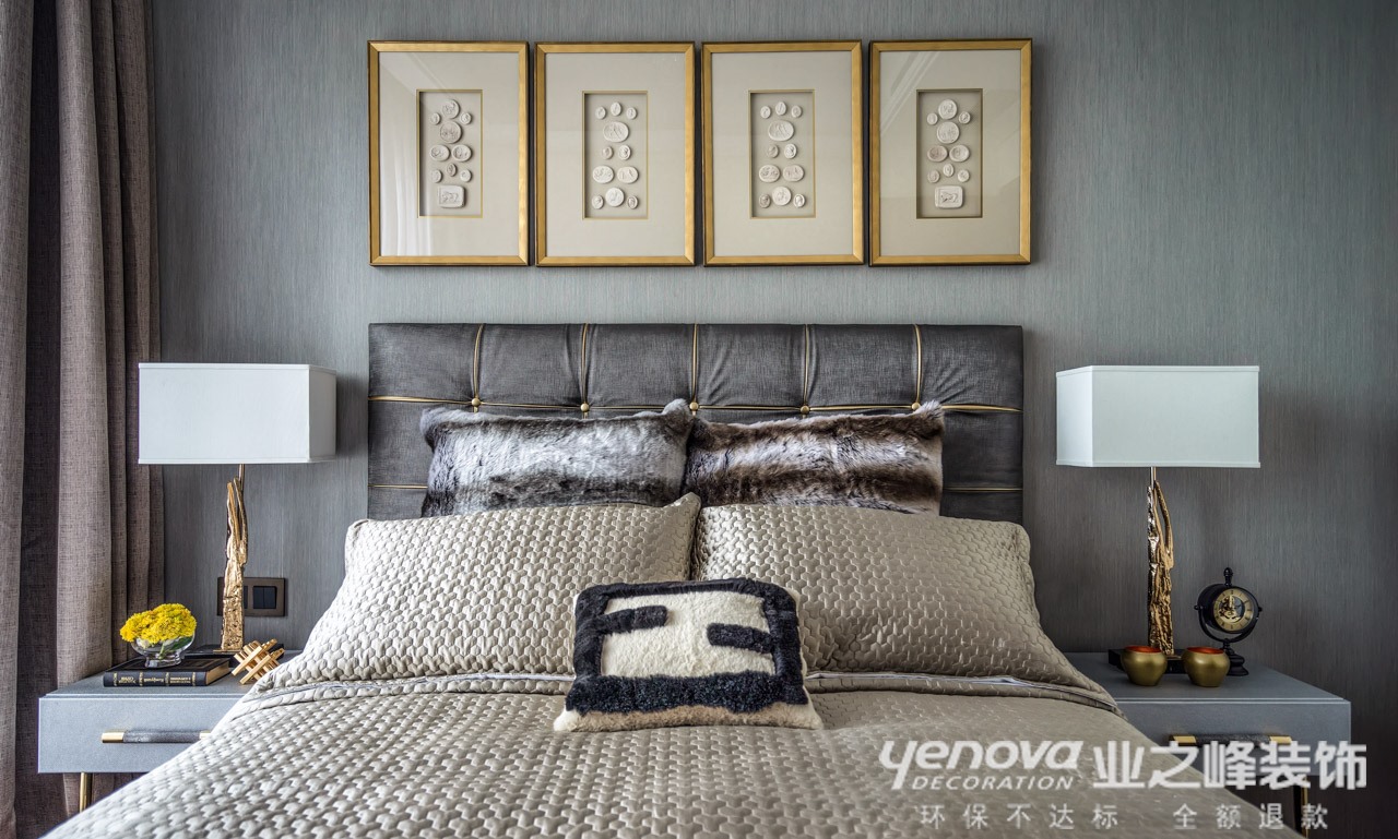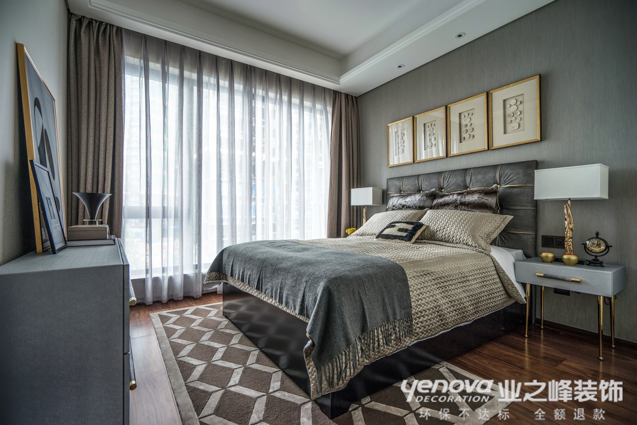 卧室地面统一采用温馨的木质地板,再墙面用灰色系的纯色壁纸体现整个空间的简约质感,点缀的使用壁挂画和玄关柜去体现卧室的温馨感,更重要的是家具的选择重点,色调是整个部分最重但是比例最少的部分。