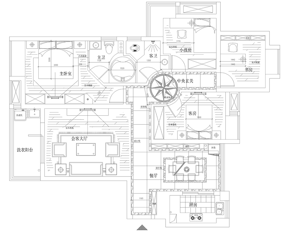 业主是一对年轻的夫妇,初次看到这个户型的时候感觉户型很好 南北通透。但是业主有个特殊的要求,希望主卧卫生间房一个圆形的浴缸。但是原来的卫生间明显没有那么大的空间。其他的房间空间都比较小,仔细考虑后觉得可以借用过道的空间,但是又不能让过道显得拥挤,所以在中间做了一个圆形的中央玄关,整个过道更加通畅,效果更美观,又达到了业主的需求。