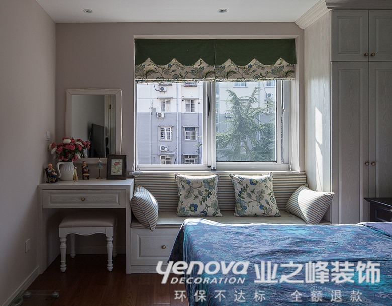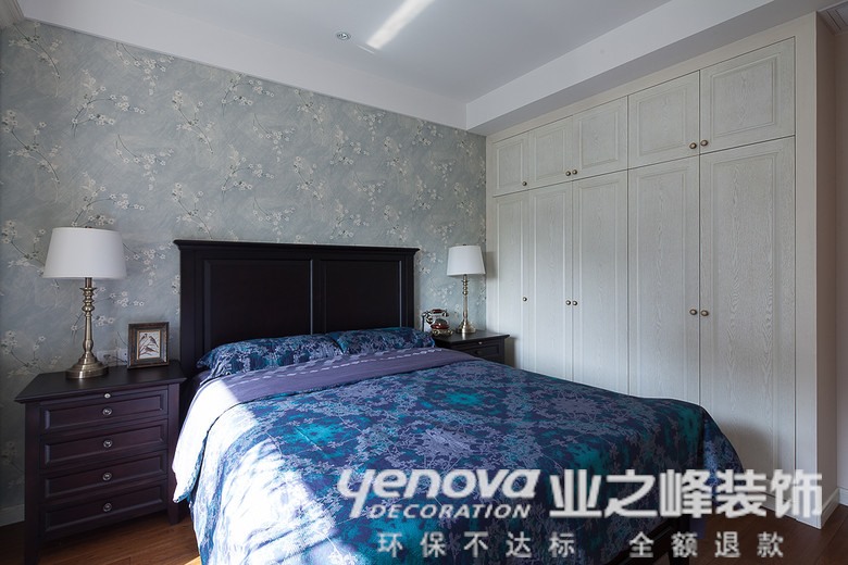 主卧室:浅蓝色的床头壁纸背景,美式床品搭配木地板,简单的装饰,让卧室空间充满了自然气息,简洁舒心,又不失温馨浪漫。