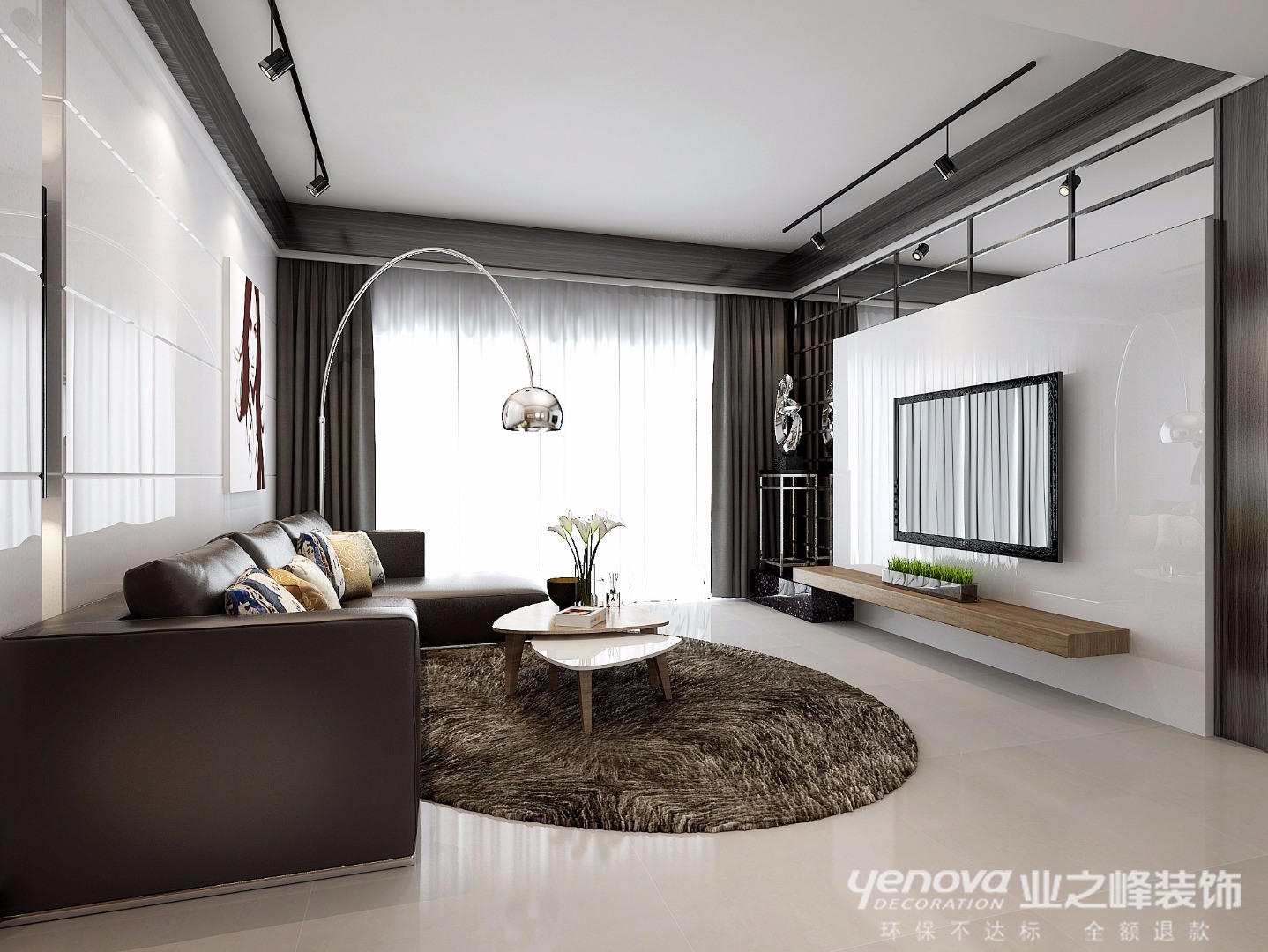 客厅作为待客区域,一般要求简洁不需要过多复杂的造型。天花板采用了直线灯池吊顶,搭配精致的钓鱼灯,营造出一种简练、明快的感觉。地面以全瓷抛釉作为装饰材料,在沙发区域铺上动物皮的地毯,使空间分区域划分更加明显。复古的蓝色皮质沙发,以及半景电视墙和挂画作为装饰,让现代时尚得进一步的彰显。