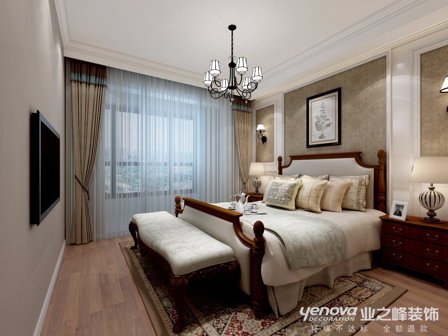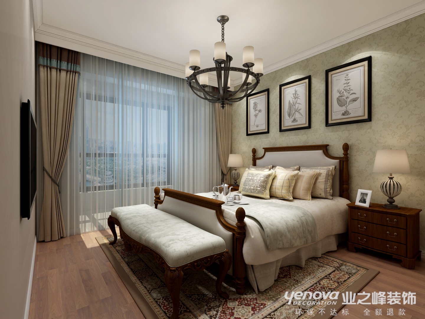 主卧背景墙的深色壁纸奠基调,配色则以围绕它进行。卧具的清晰植物元素。很有美式的味道。