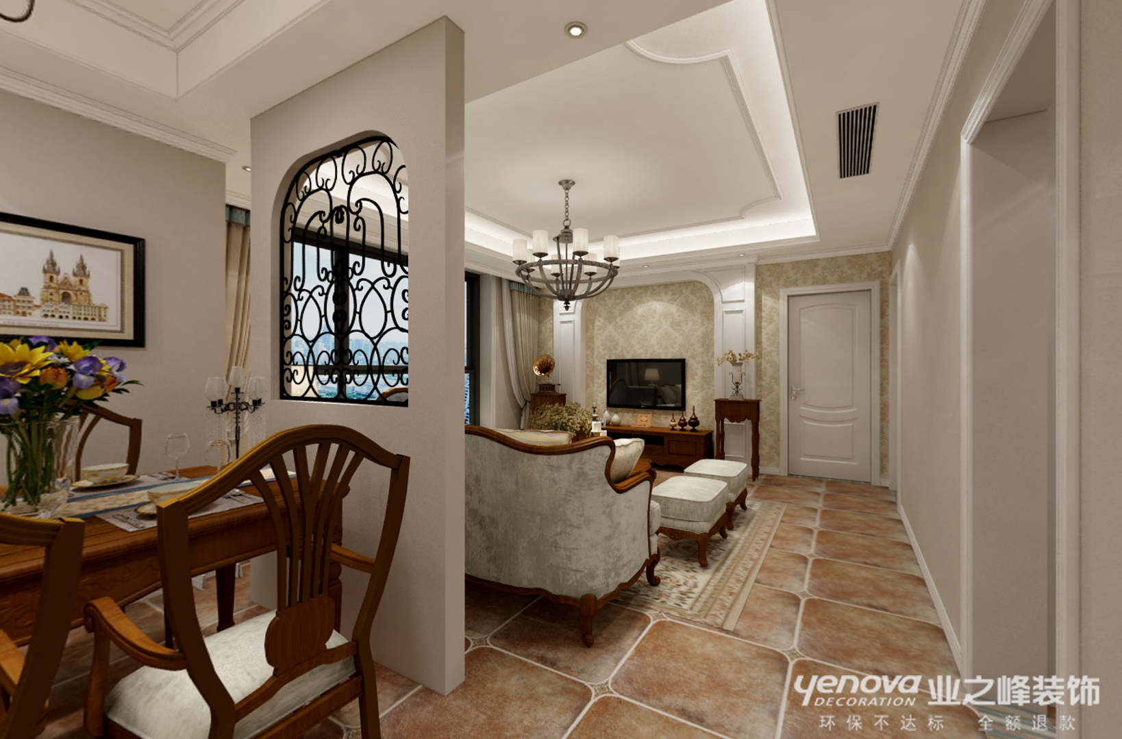 镂空隔断巧妙的成为了沙发墙.使空间隔而不断,空间相对独立又连贯而又统一。