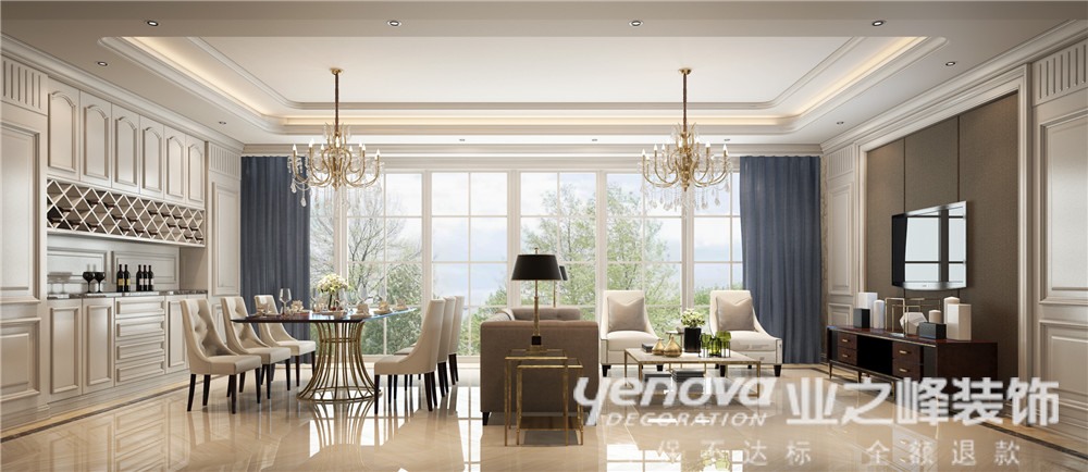本案的整体色调以浅暖色调为主,以米黄、豆绿色为背景色,白色和棕色做主体色,浅咖色、金铜色、绿色、红色做为点缀色。层次丰富,色相上大体以米黄、咖啡色、棕色等中性色为主,使的整体色调丰富而不失主次,统一而不单调.再配以绿色和红色为主的花艺及绿植,整体色彩典雅,高贵而富于生活气息。