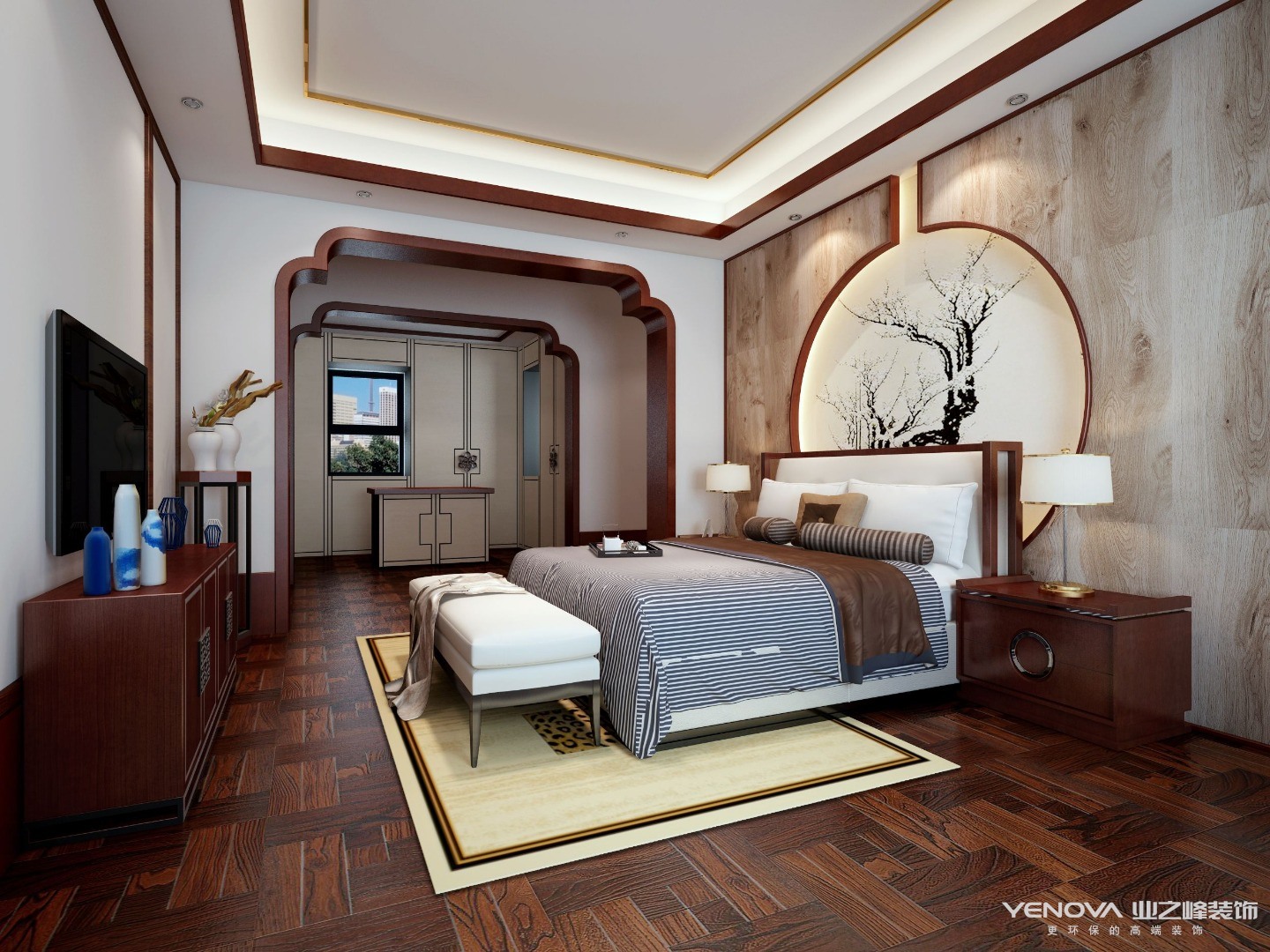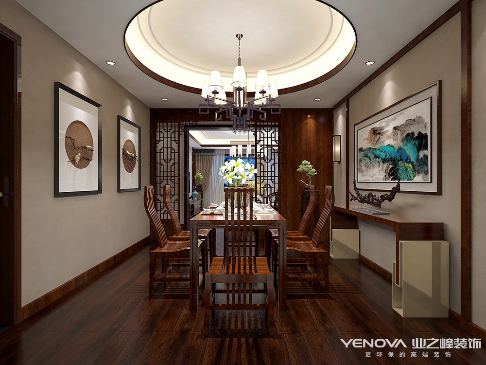 客餐厅的镂空木质隔断使用较多,地面铺装采用的全房木地板,提升空间的厚重感,客餐厅天花吊顶以矩形顶和圆顶进行区分,沙发背景墙以小幅现代画作为装饰,电视背景墙以简约的大理石进行装饰。卧室的天花也进行简单的包边,重点在墙面的镂空木门装饰,提升了空间的中式味道,又不失时尚感。