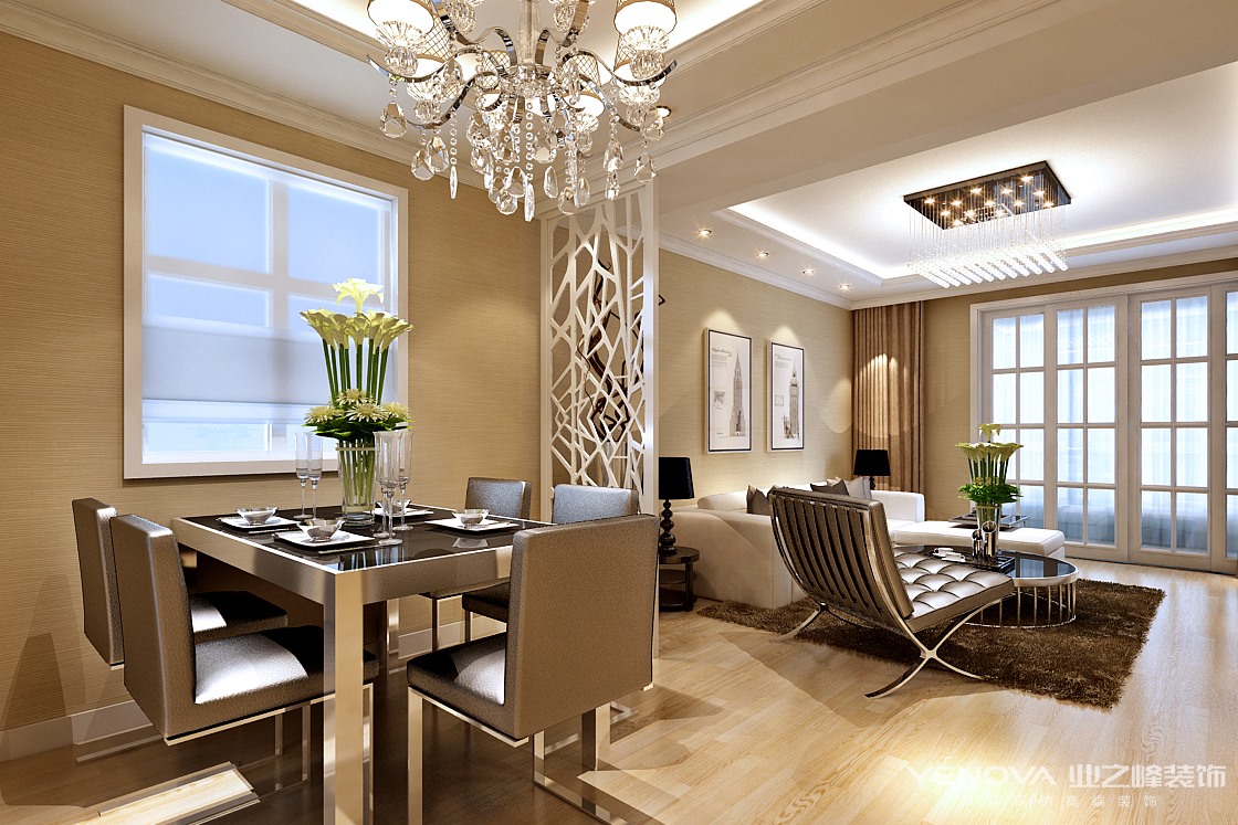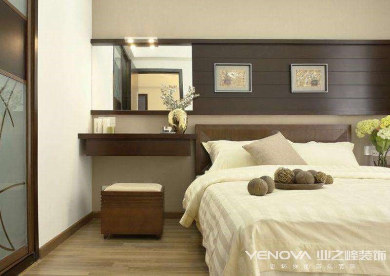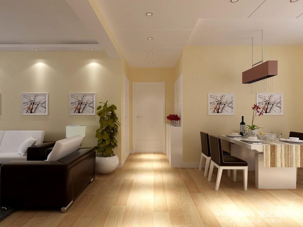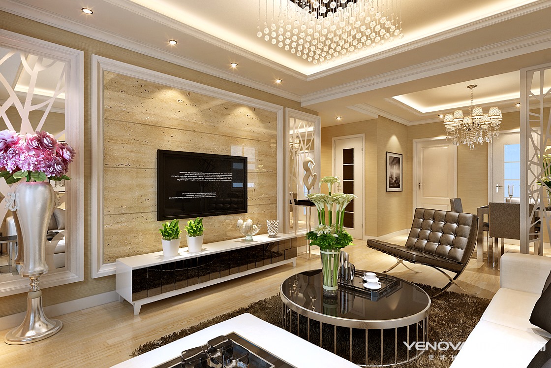 客厅主要以白色为基调,藕色和灰色作为点缀,简约装饰对色彩、材料的质感要求很高,因此,空间设计通常能达到以少胜多,家具以白色为主,墙面以原木色为主,顶部做了简单的灯池吊顶,精美的水晶灯提升室内的明亮度,加之现代化的装饰品点缀,从而让生活在快节奏、高频率的人们在回到家以后能得到一种能彻底放松。卧室采用简约却有质感的深色家具,让空间看起来更加沉稳内敛。