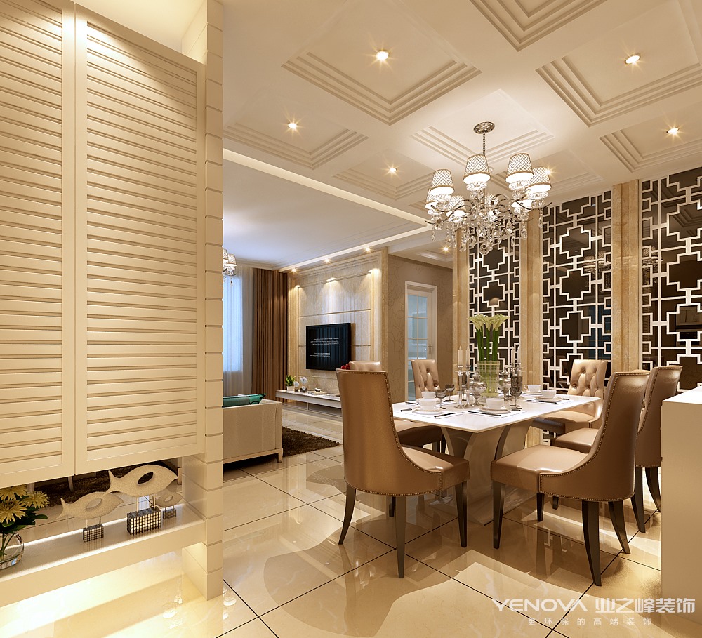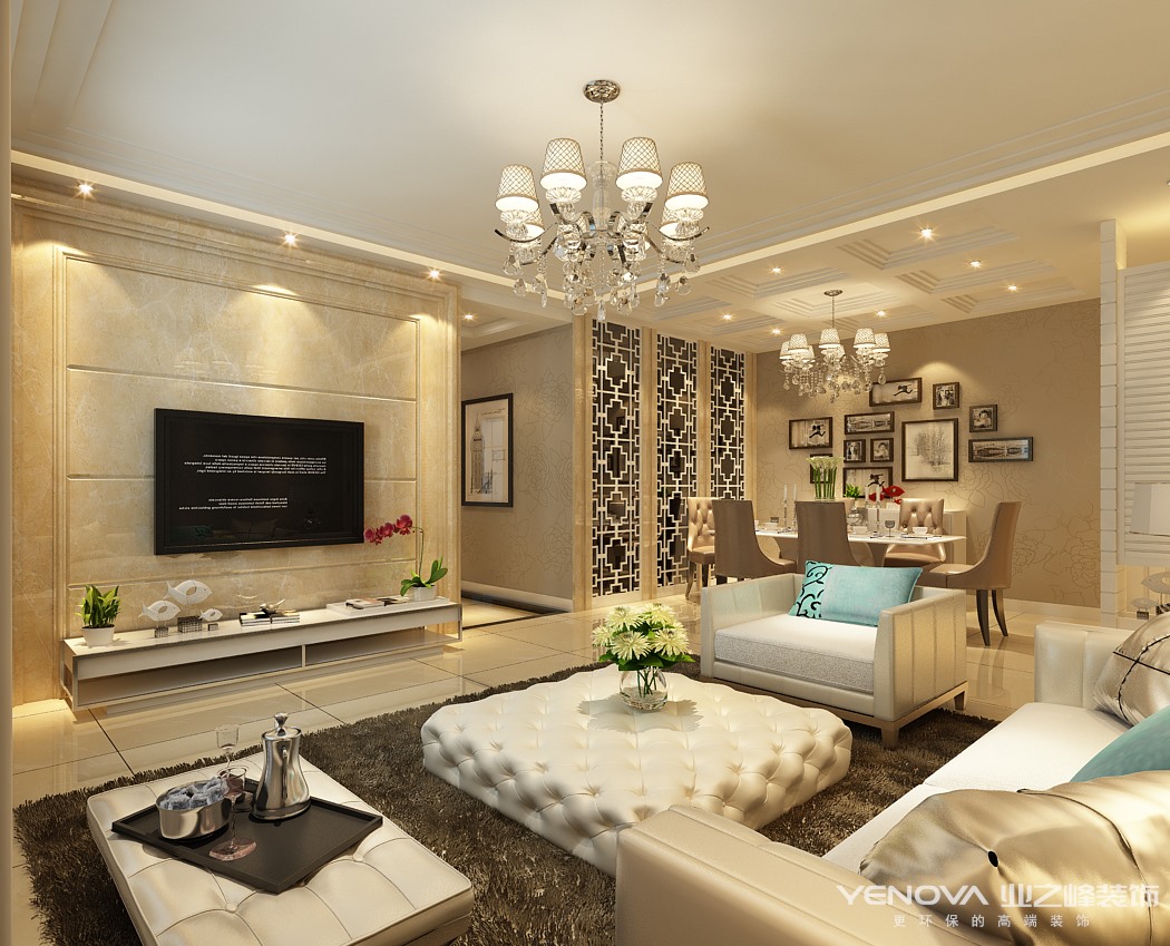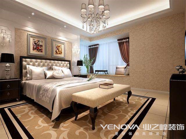 客厅顶部用华丽的水晶吊灯营造气氛,墙面用优质乳胶漆,以衬托豪华效果。地面材料以石材为主。乳白色家具和布艺沙发,都是点缀客厅的重要因素。布艺沙发组合将传统欧式的奢华与现代的实用性完美地结合。卧室采反射灯光照明和局部灯光照明,室内则有壁灯和油画,置身其中,舒适、温馨的感觉袭人。