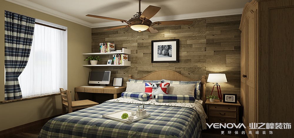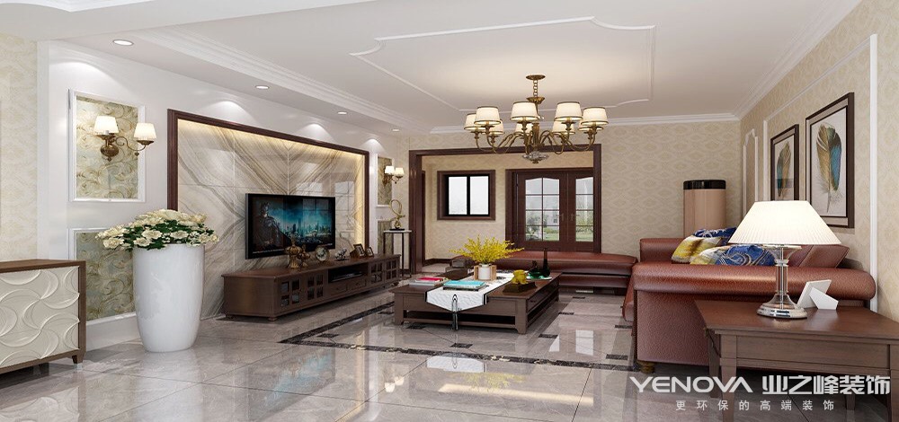 本案风格定位为简美的设计风格,在材质和色彩方面以沉稳的木色为主,造型朴素优美,色彩浓厚而成熟。美式风格的装饰主要体现在家具,再辅以美式的壁纸等软装配饰加以烘托。整体家居色调简洁明快,不需要复杂的结构造型及线条,白色的石膏装饰造型配以纯净的大块石材作为电视背景墙,优雅大方,同时便于打理卫生,客厅沙发以舒适的牛皮材质作为主体,彰显档次的同时兼顾舒适性。整体的墙面部分采用素色壁纸为主体,很好的烘托得空间气氛,使空间色彩实现了更好融合与统一。