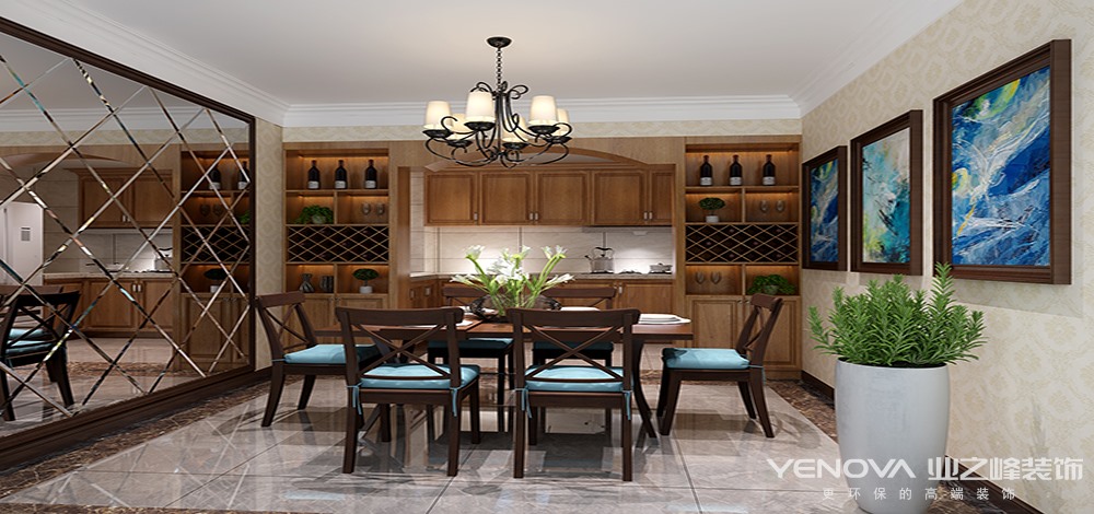 餐厅精致的的餐桌椅吸引人的眼球,石制的踢脚线与木制家具和谐搭配,丰富了空间的对比。墙壁上整齐排列的挂画体现了中式方正的风格。