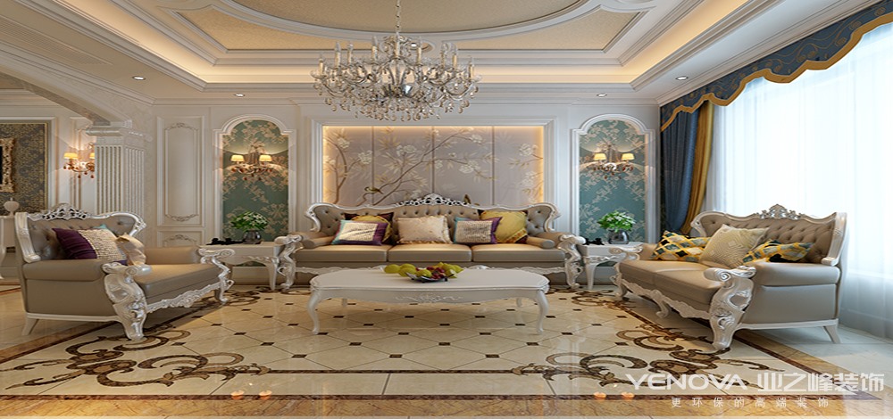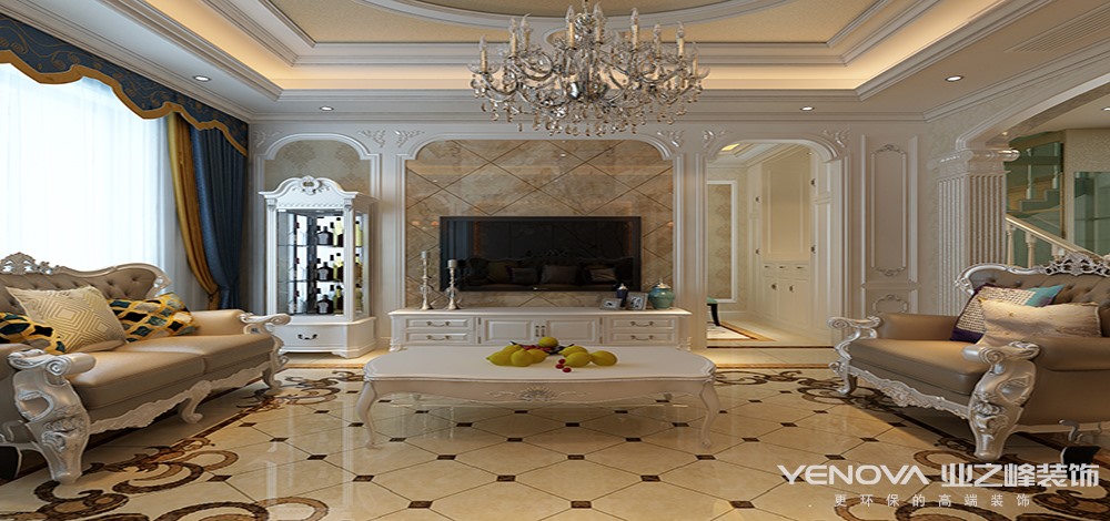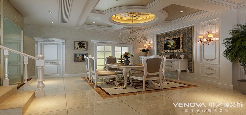 整个空间的布局强调轴线的对称,气势恢宏与豪华舒适相得益彰。空间呈现出高贵典雅的居家氛围。细节处理上采用雕花﹑线条﹑铜条以及不同种颜色大理石材质的拼接,其工艺精细考究。