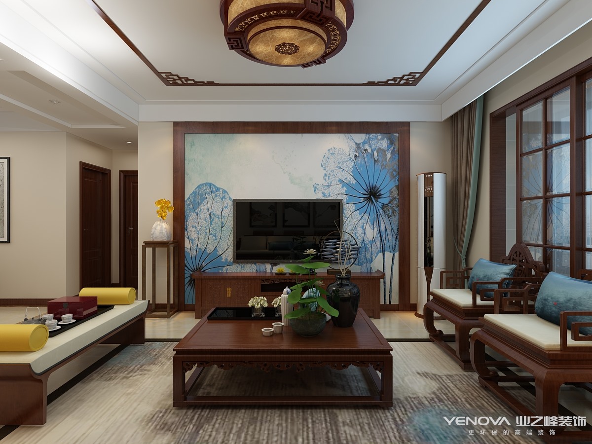 蓝色荷花壁画的影视墙面与沙发背景墙组合挂画相结合,面与点的结合呼应使整个空间大气庄重。