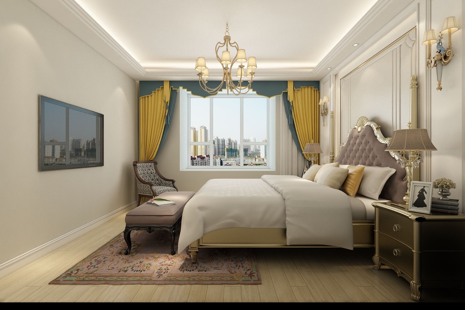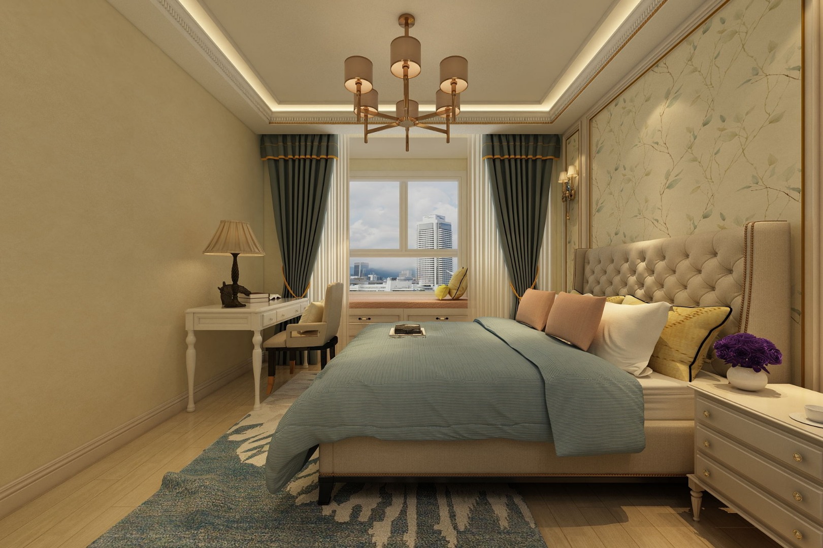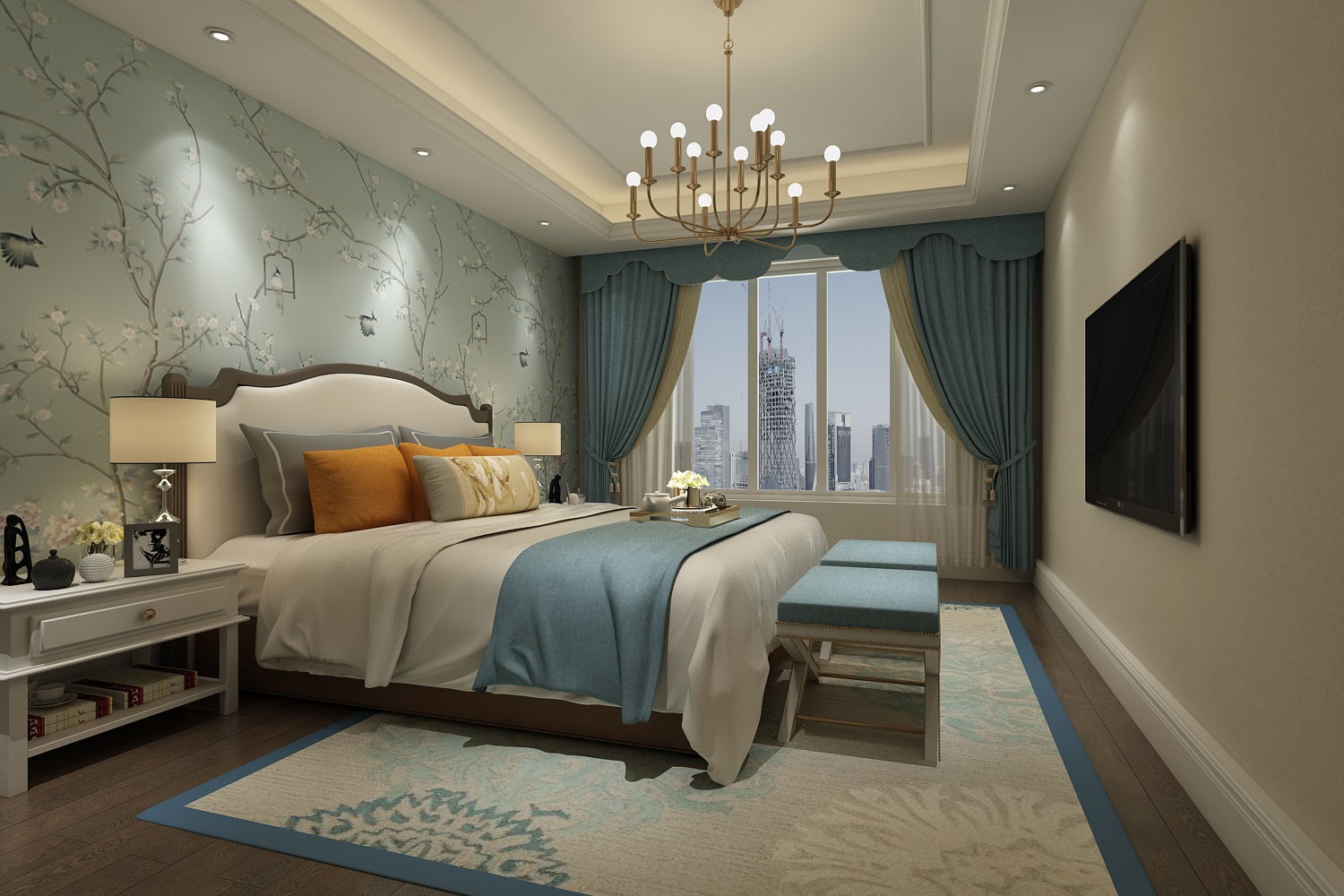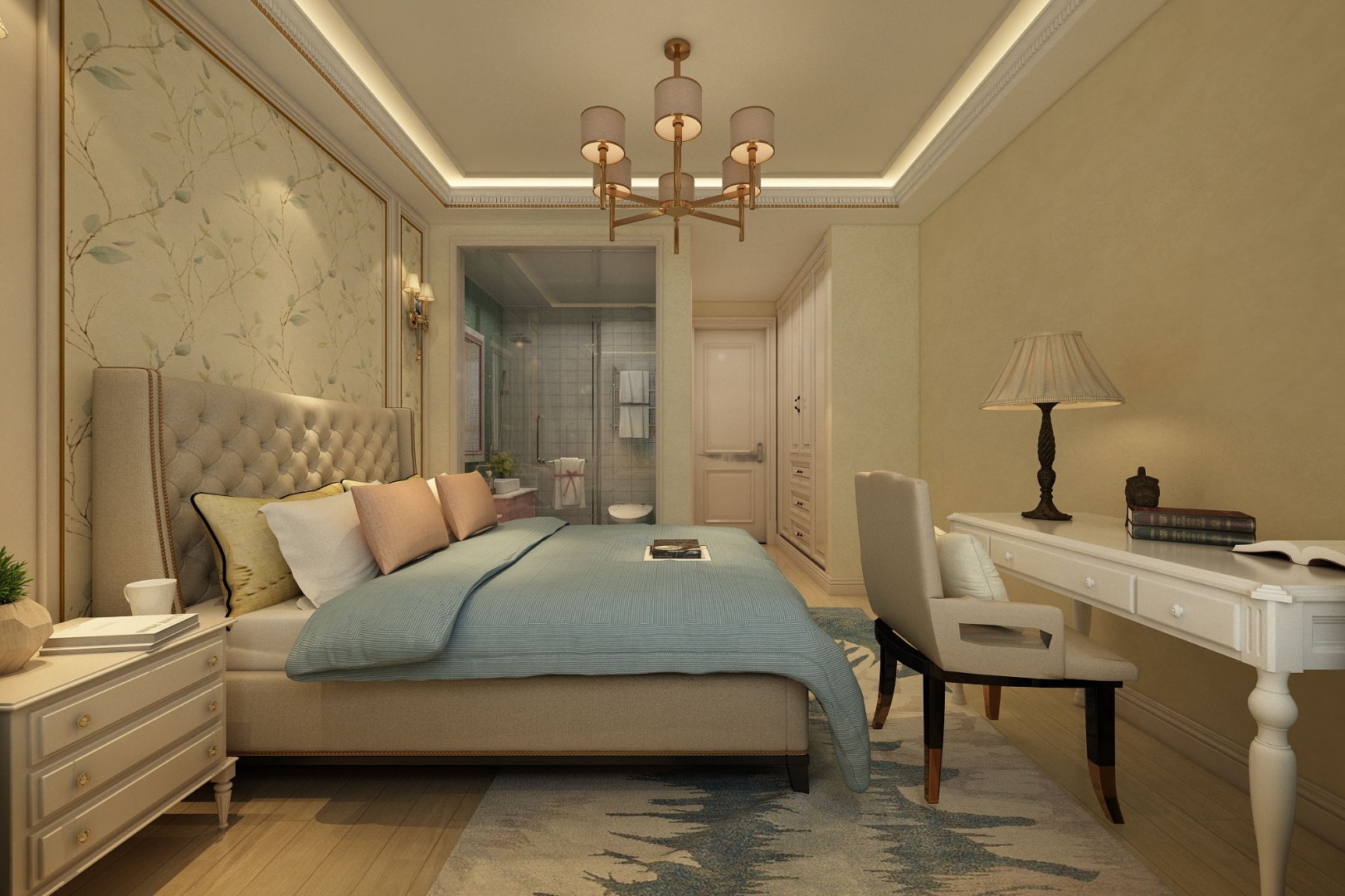 美式家居的卧室布置较为温馨,作为主人的私密空间,主要以功能性和实用舒适为考虑的重点,一般的卧室不设顶灯,多用温馨柔软的成套布艺来装点,同时在软装和用色上非常统一。