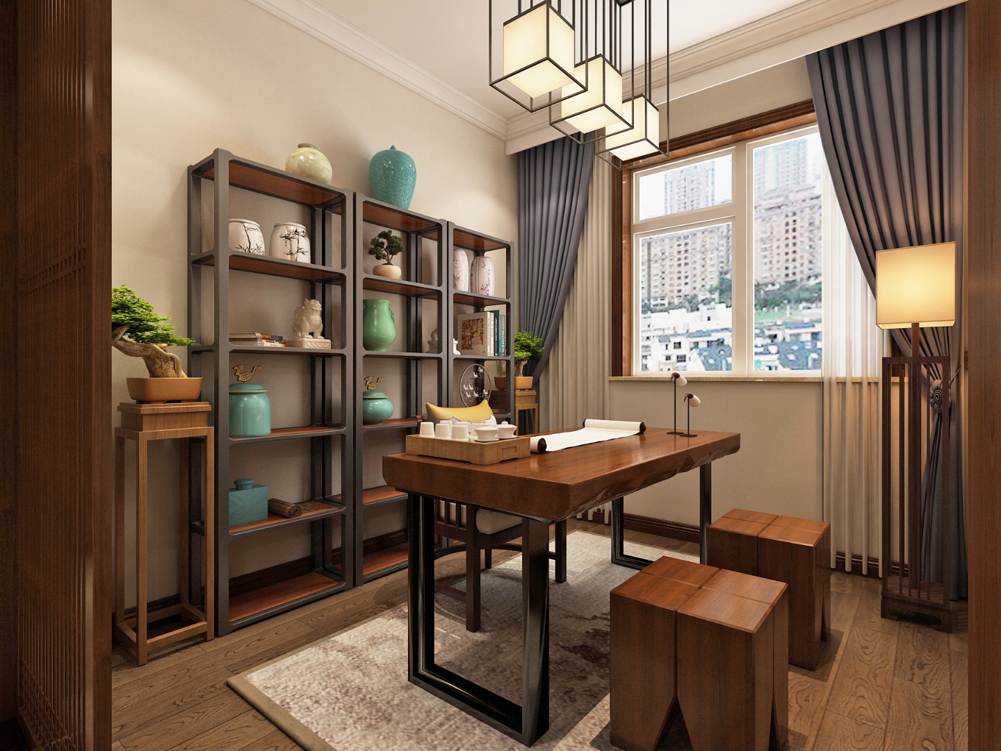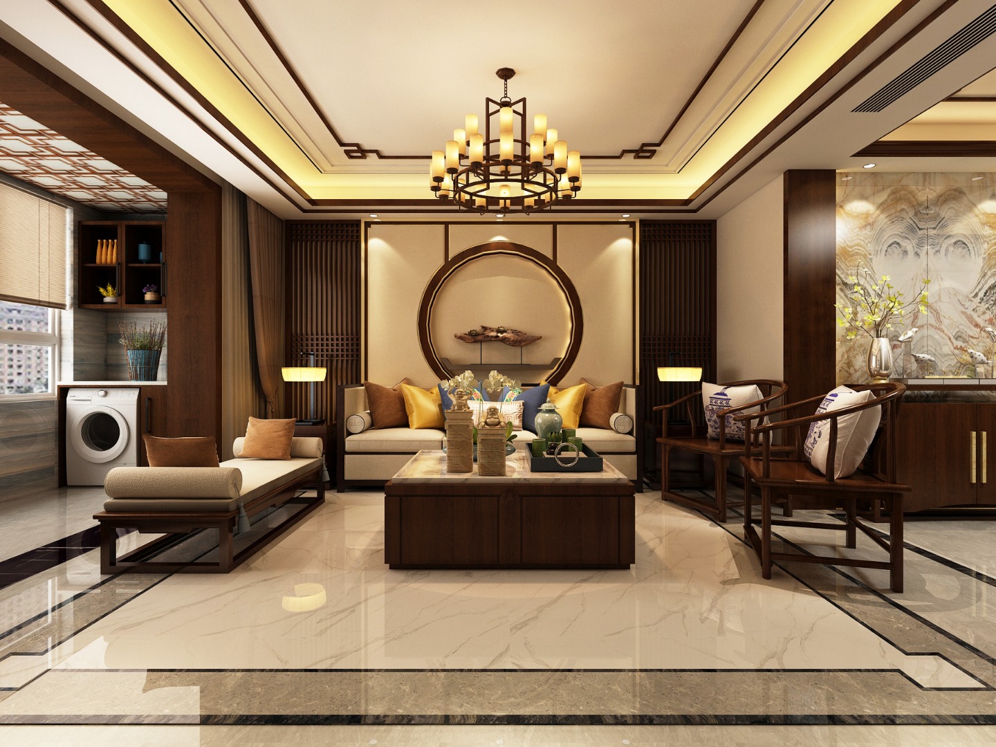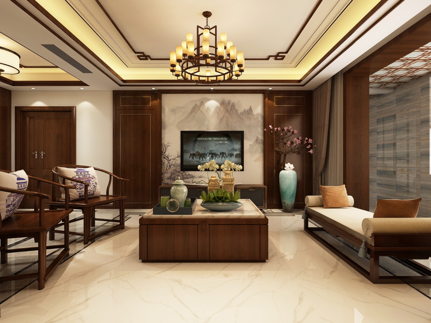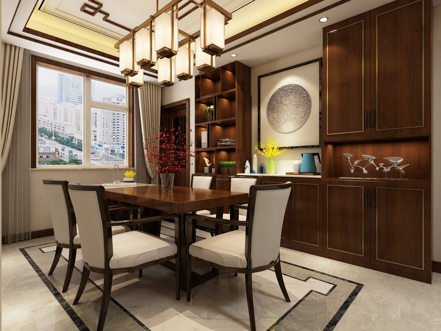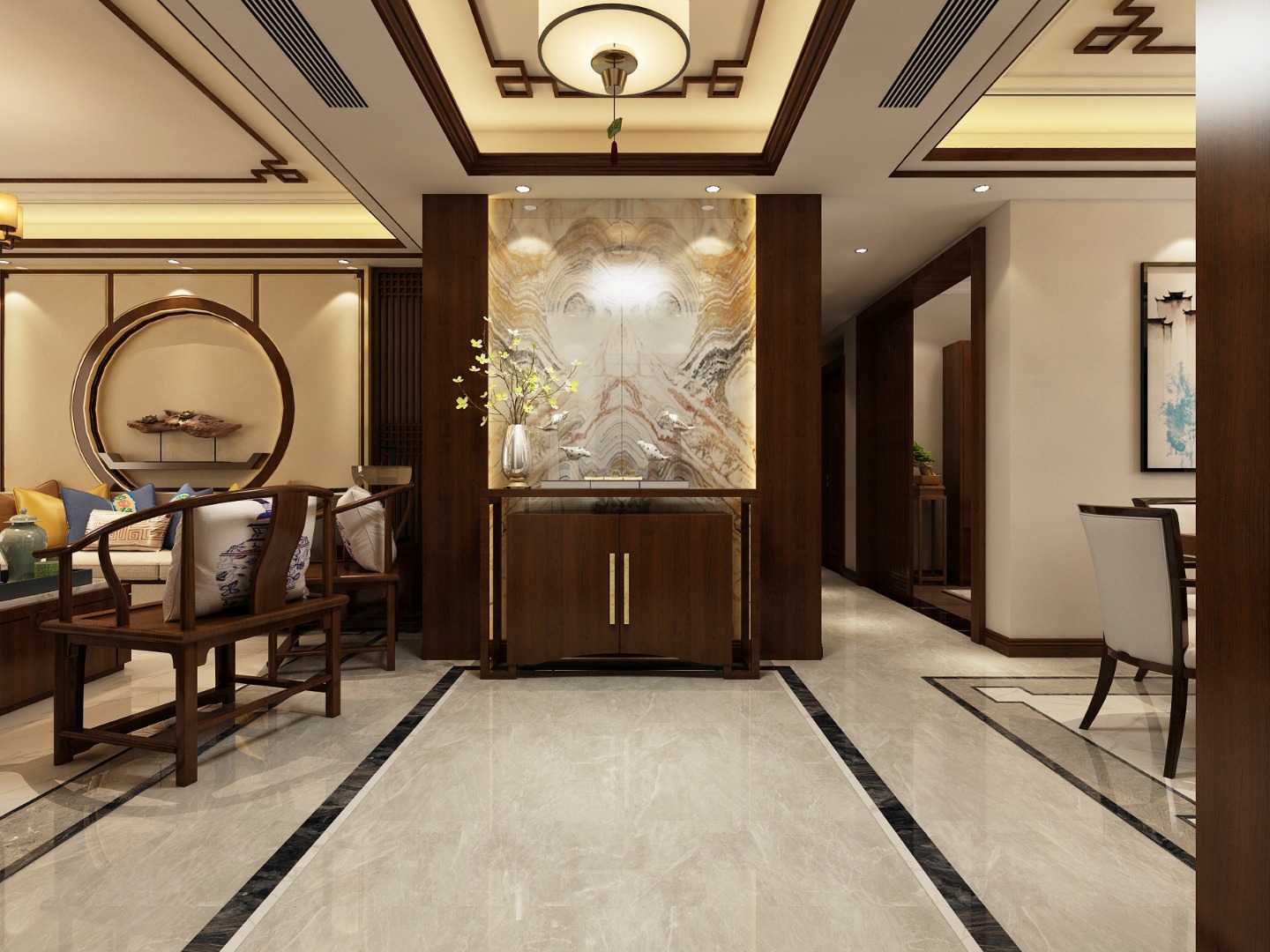 风格定义为中式风格,定向定为新中式。本案的设计重点是会客空间与门厅、餐厅以及,过道空间互通与交流,从设计手法上采用了从墙面上的线与面的衔接呼应,以及顶面的空间的虚拟划分,达到各功能空间融会贯通的目的。