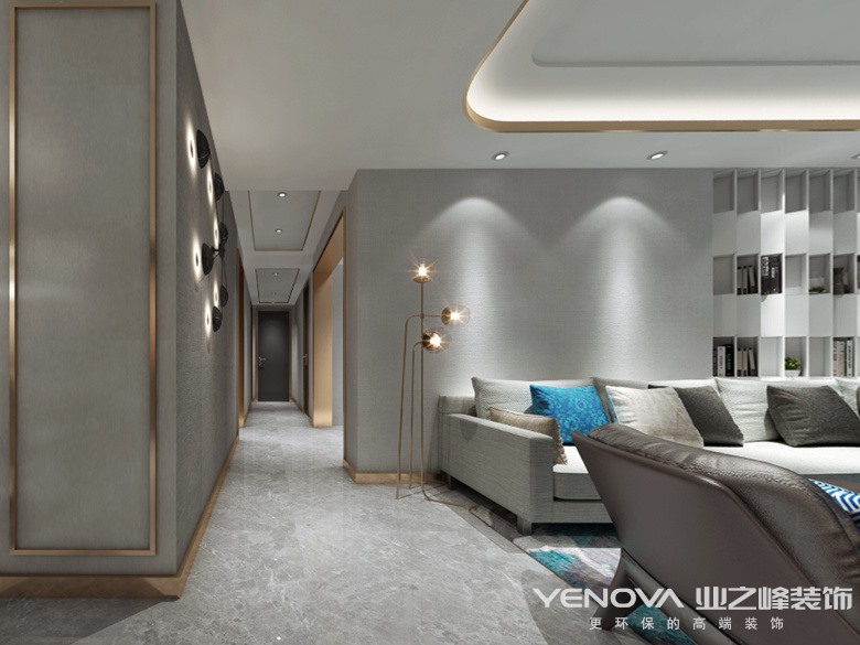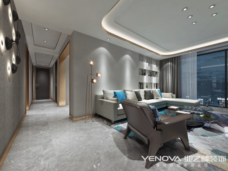 以现代风格为基调,与男主人时尚感的气质十分契合,灰色系的大理石地砖,金属质感的线条点缀空间,在色彩上用软装加以跳色处理,使原本灰色基调的冰冷材质柔和。
