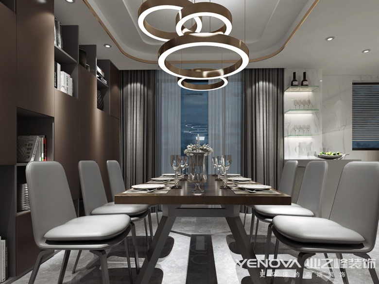 客厅白色大理石的背景墙让空间层次感更强,加以灯光点缀氛围感十足。餐厅选用镜面的门板材质,咖色系的深沉与整个空间更加协调,开放式的厨房设计使整个空间视野开阔,扩大空间的延伸感。富有艺术感的灯具让空间更有趣味性。