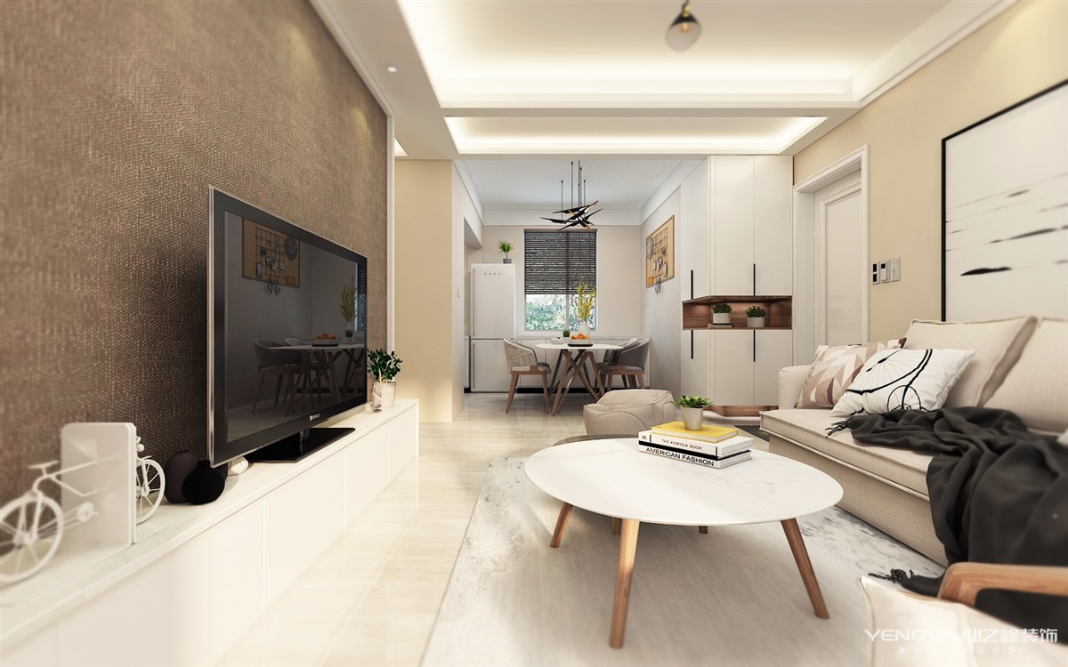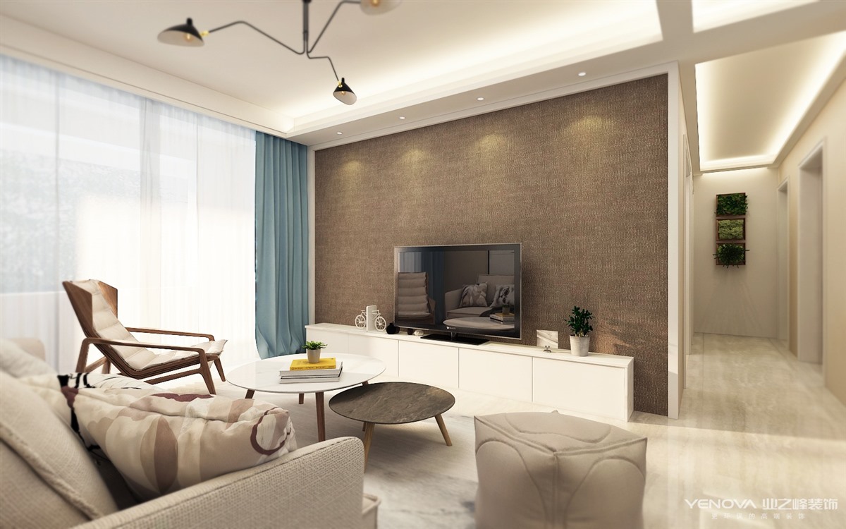 为了满足客户想要的时尚摩登感,设计师在现代风格中搭入一些木质材质进去,使整体色调更显温馨客厅