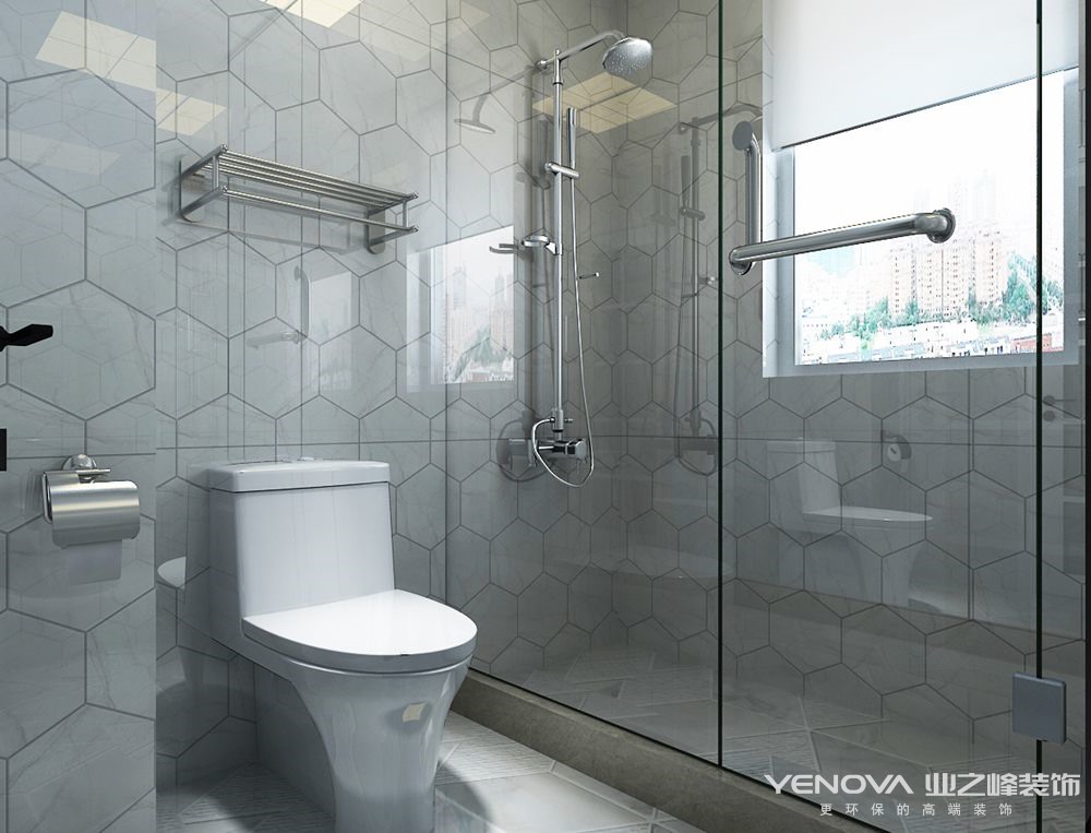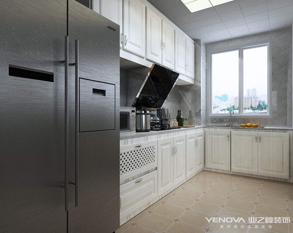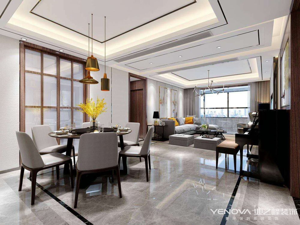 整屋瓷砖使空间明快剔透,墙面简洁的造型使整体更显高端大气。天花的设计在视觉上增加了层高,灯池,筒灯,吊灯相结合的照明设计在满足了空间明亮度的基本要求后丰富了空间的层次和色彩。