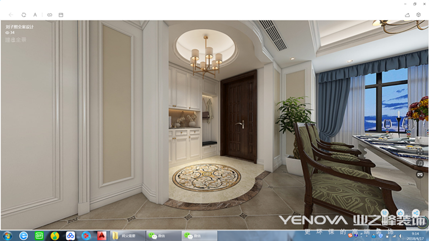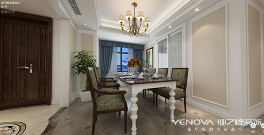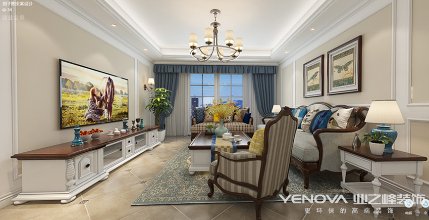 本案特别选用了美式的设计主题。在有限的空间设计上显得有品位。客餐厅地面全铺实木复合地板,客厅的电视背景设计方面使用了,墙布与pu线条白色乳胶漆相结合。客厅