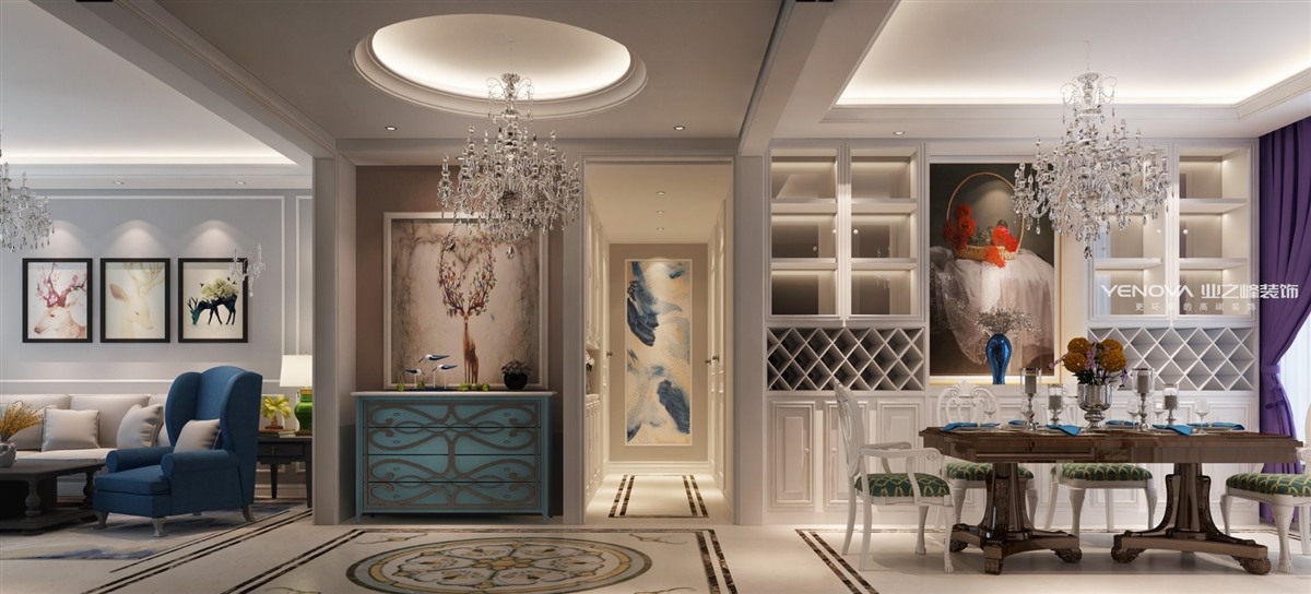 简美风格是美式古典风格的延续,简美风格的特色是将设计的元素、色彩、照明、原材料等简化到最少的程度,但是对材料得色彩质感要求很高。简美风格整体给人一种简约大气的气息,没有过多复杂得空间布局,每处都格外的干净利落,而且现代实用,无论是房顶得吊灯,还是脚下的瓷砖,都没有繁琐多余得设计,表面光滑柔和,让人觉得温暖而舒适。在此次方案设计中,客厅一般以白色为主色调,充满美式元素的客厅吊顶让空间显得更加华贵。玄关处的材料选择也多是用光挺、华丽的主材。整体设计上给人带来清爽明快之意,宽敞的空间布局让人更加舒畅。简美风格在传统美式风格上更加简约精致,流露出来的自由随性的气息也符合美国的人文风俗。