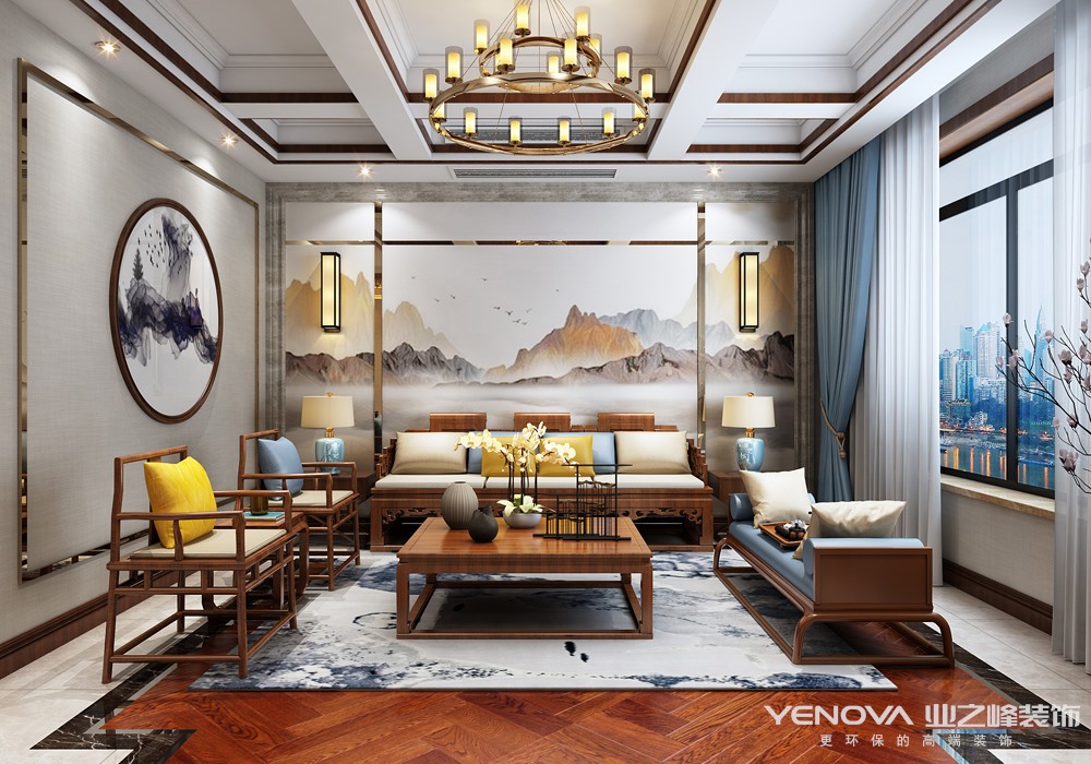 客厅——地面仿地板瓷砖运用,金色大山作为背景诗情画意油然而生。