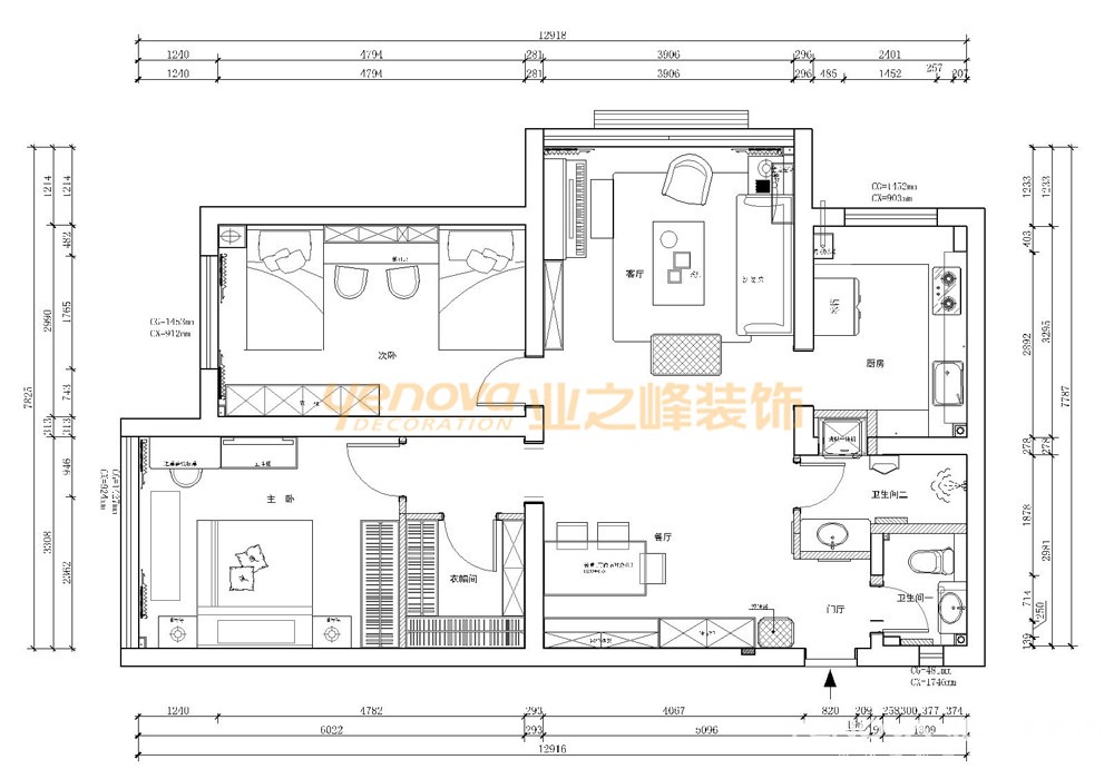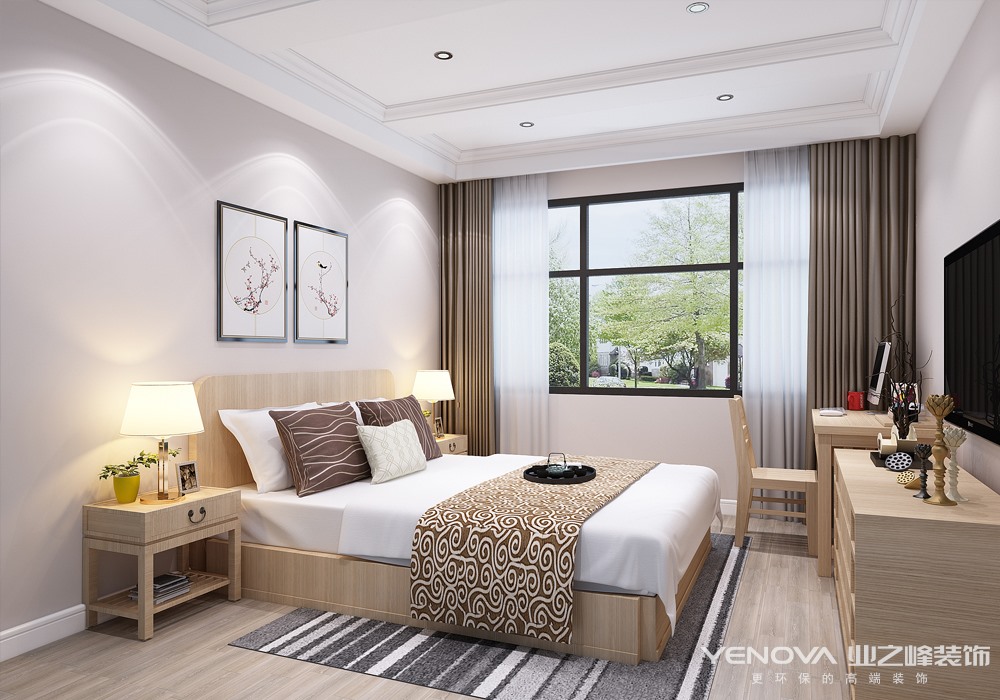 主卧——顶面全部平面吊顶,不用裸露灯具,采用LED射灯布光。
