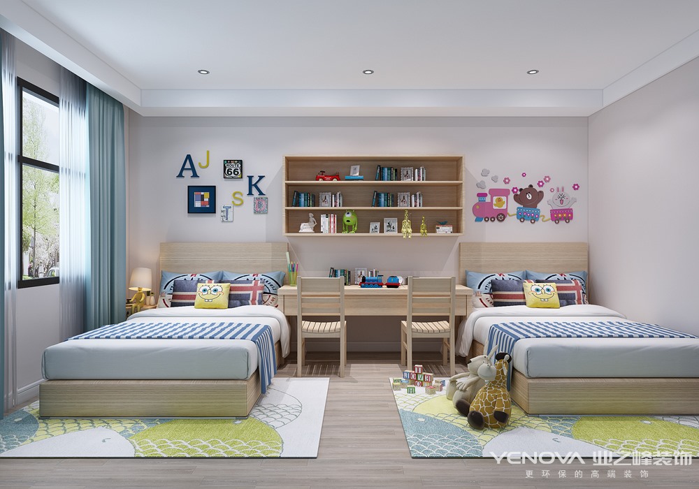 儿童房——年龄只差两岁的小哥俩同时住在一个卧室,每人一张单人床,但是同时用一张大书桌!既有独立的小空间,又可以一起学习。