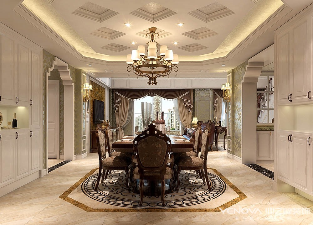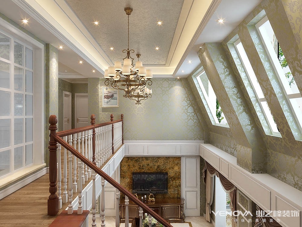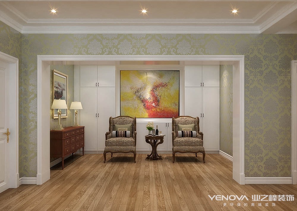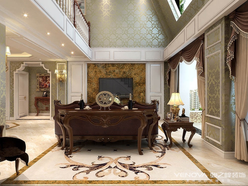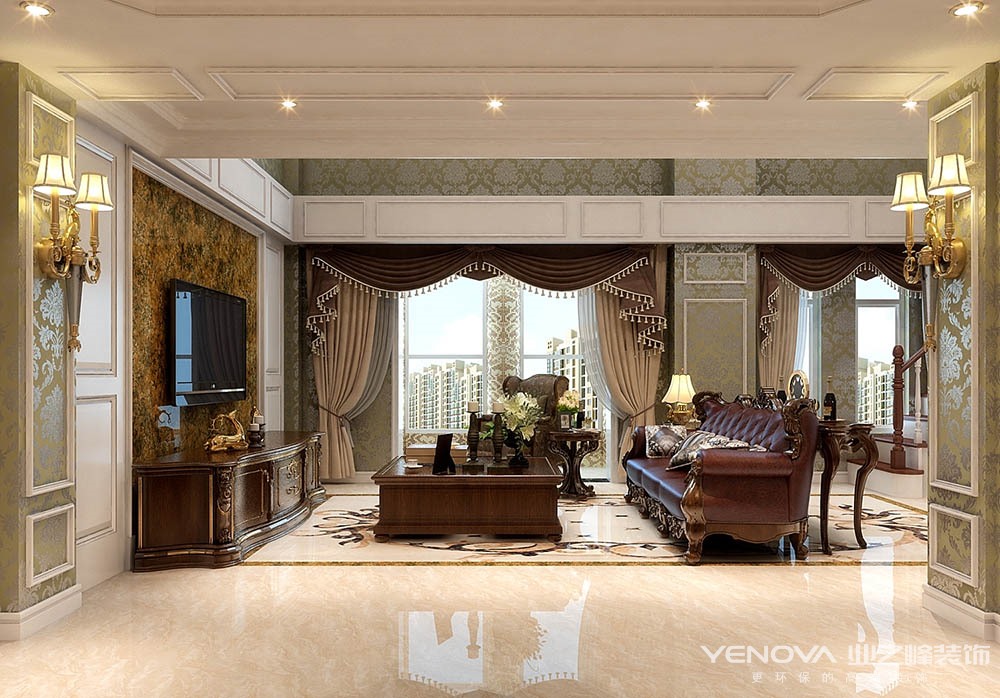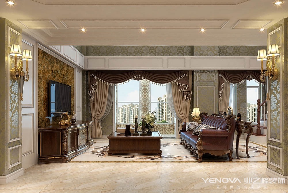 本案的设计风格简约欧式,力求表现悠闲,舒适的生活氛围。欧式风格强调以华丽的装饰、浓烈的色彩、精美的造型达到华贵的装饰效果。欧式客厅顶部用大型灯池,并用华丽的枝形吊灯营造气氛。门窗上半部做成弧形,并用带有花纹的石膏线勾边,室内则有壁灯造型。墙面用优质乳胶漆,以衬托豪华效果。地面材料以石材和地板为主。欧式客厅用家具和软装饰来营造整体效果,深色的像木和枫木家具,色彩鲜艳的布艺沙发,都是本案欧式客厅里的主角。还有浪漫的罗马帘,精美的油画,制作精良的雕塑工艺品,都是点染欧式风格不可缺少的元素。客厅的大部分在挑空结构之下,大面积的玻璃窗带来了良好的采光,落地的窗帘很是气派。布艺沙发组合有着丝绒的质感以及流畅的木质曲线,将传统欧式家居的奢华与现代家居的实用性完美地结合。壁灯自然不可或缺,它被安置在空间的交汇处,又与四幅色彩鲜艳的油画相呼应,给敞开式的客厅提供了一个新的亮点。