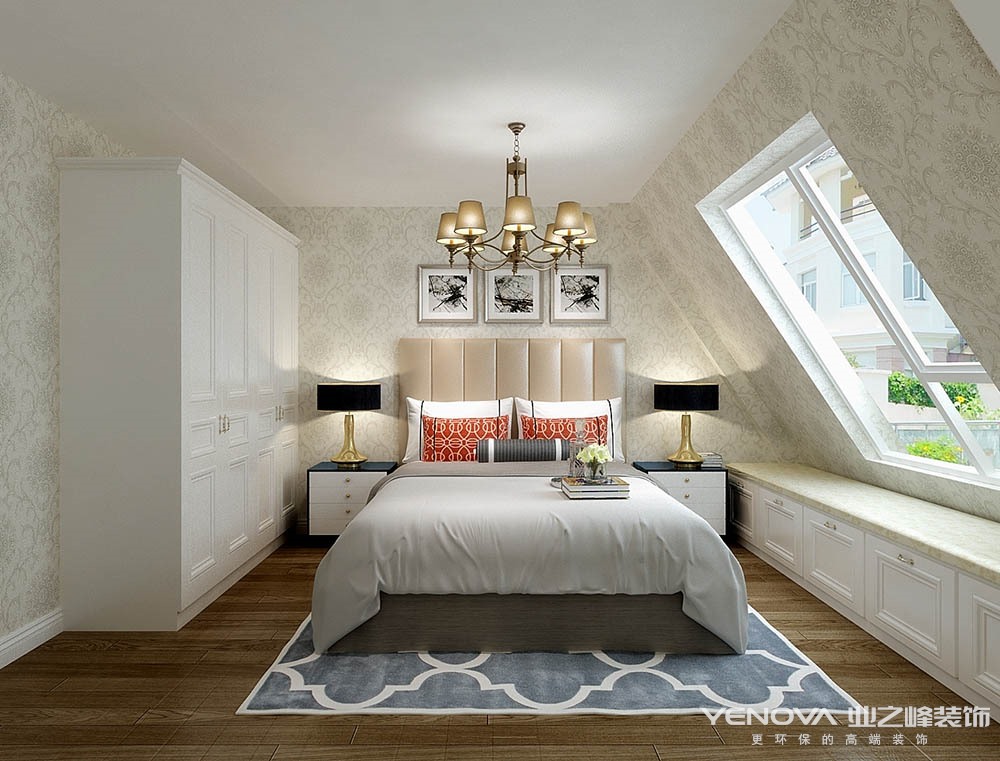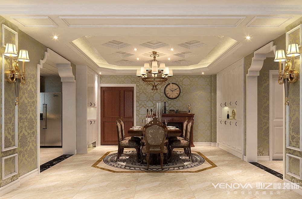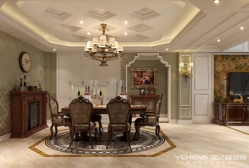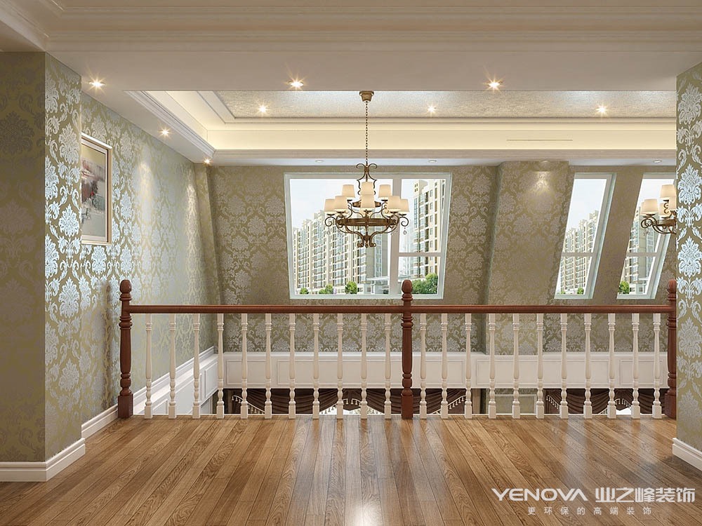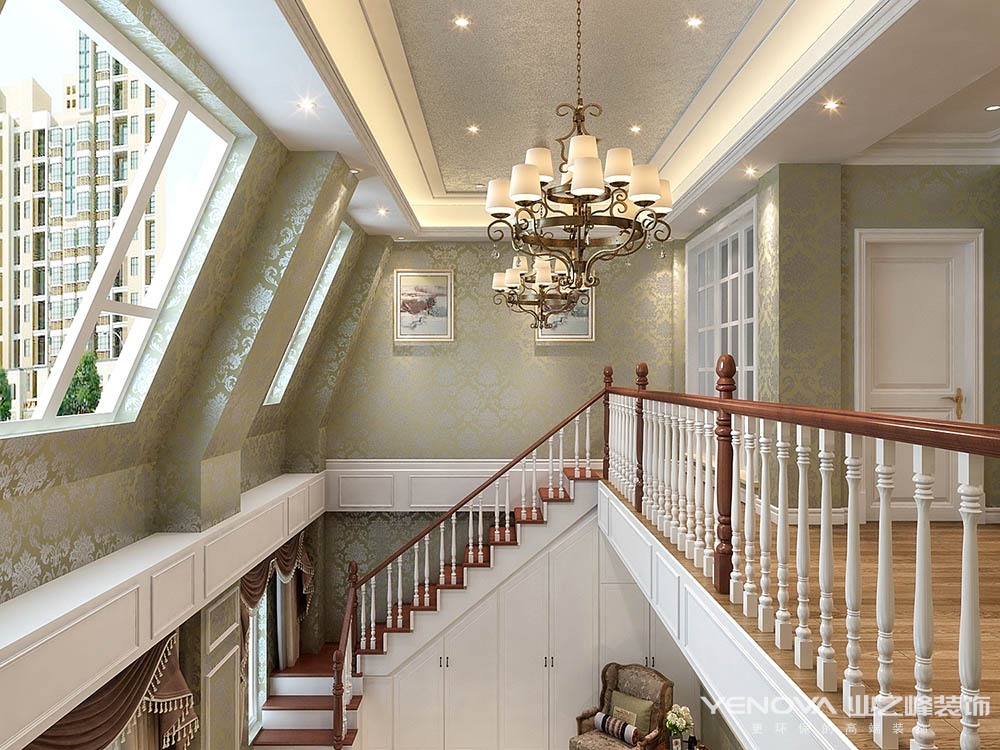 本案的设计风格简约欧式,力求表现悠闲,舒适的生活氛围。欧式风格强调以华丽的装饰、浓烈的色彩、精美的造型达到华贵的装饰效果。欧式客厅顶部用大型灯池,并用华丽的枝形吊灯营造气氛。门窗上半部做成弧形,并用带有花纹的石膏线勾边,室内则有壁灯造型。墙面用优质乳胶漆,以衬托豪华效果。地面材料以石材和地板为主。欧式客厅用家具和软装饰来营造整体效果,深色的像木和枫木家具,色彩鲜艳的布艺沙发,都是本案欧式客厅里的主角。还有浪漫的罗马帘,精美的油画,制作精良的雕塑工艺品,都是点染欧式风格不可缺少的元素。客厅的大部分在挑空结构之下,大面积的玻璃窗带来了良好的采光,落地的窗帘很是气派。布艺沙发组合有着丝绒的质感以及流畅的木质曲线,将传统欧式家居的奢华与现代家居的实用性完美地结合。壁灯自然不可或缺,它被安置在空间的交汇处,又与四幅色彩鲜艳的油画相呼应,给敞开式的客厅提供了一个新的亮点。