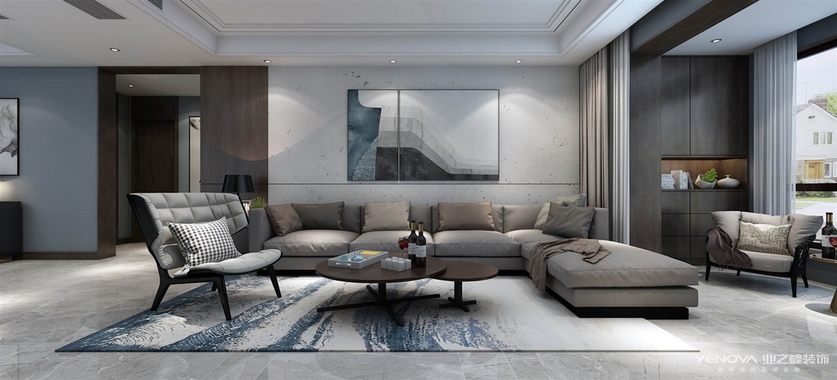 在本案设计中,也尽致满足了科技精英的偏好与需求,在另类新奇中体现设计美感,在理性阳刚的科技气质中杂糅进意义含糊的新浪漫和奇诡天真的想象元素,因跳出常规而更加倾泻出引人入胜的生活乐趣。现代的艺术装置与背景的装饰画互相呼应,几何形制的家具,低调中彰显着现代精英气质。低饱和度的浅灰色与灰蓝色之间有幽微的碰撞,别致的金属异型吊灯,与家具的线条结构相互呼应,营造出与众不同的空间魅力,其中有温暖的冷静、个性的简约。