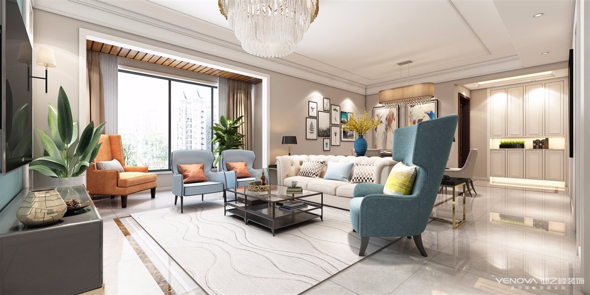 客厅设计具有简欧风格的大气典雅,同时带有些许时尚简约感,空间以米白色为主调,并点缀各种清透的蓝色,整体带有水洗般的澄澈感。简化的欧式线条明快利落,天花简单而别致,同样图案的浅灰色地毯与其交相呼应,仿若其投下的倒影,让人想起徐志摩的一句诗“我是天边的一片云,偶尔投点在你的波心”。欧式吊灯,彰显出一种古典欧式的雅致韵味,现代风格的家居又增添了简约清爽感,而暗蓝色的沙发窗帘、蓝色水晶饰物以及浅蓝色的风景画,与落地窗外春城碧蓝如洗的天空“一脉相连”,有着人间四月天的清新明朗。