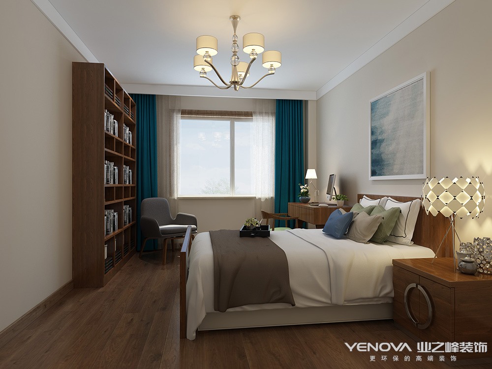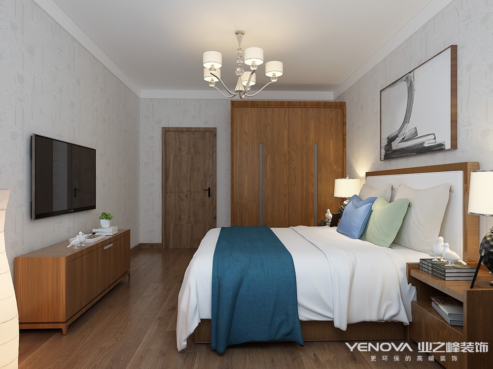 主卧地面工字铺贴木质地板,搭配暖色的壁纸墙面,整体给人简约干净的视觉效果。