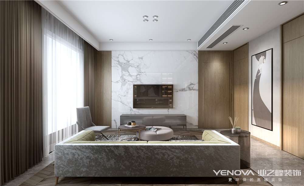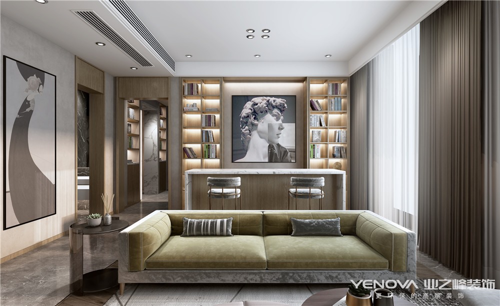 对于家的遐想,不需要它繁复奢华,但必须带有居住者自身品味。本案业主希望这个家有自己的风格,低调又精致,能呈现自身有生活品质,且能极好的满足生活功能。在客厅沙发背景墙用书柜做隔断,充分的利用了空间的是功能,也让空间增加了美感,更加有层次感。