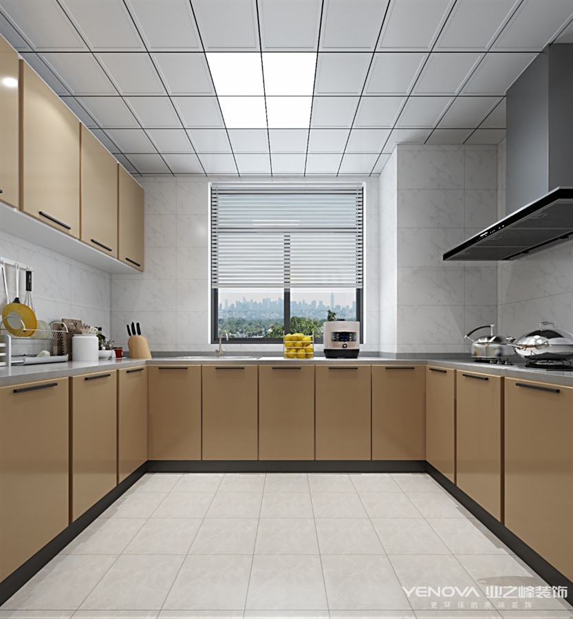冰箱放到储物间后,厨房为U字型,洗、切、炒,电器功能全部满足。光滑釉面墙砖,亮度高易清洁,搭配香槟金宝马烤漆门板,符合整体简约风格也满足了客户对厨房的要求。