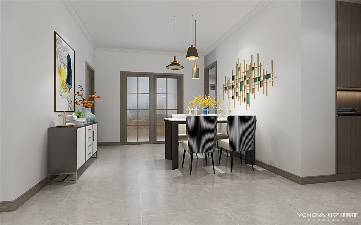 纯白的乳胶漆涂料使空间显得质朴,餐桌造型简单,与空间颜色相称的吊灯、现代金属材质的墙面装饰构成了一个整体,餐边柜搭配上装饰画,极大的增强了整体格调。