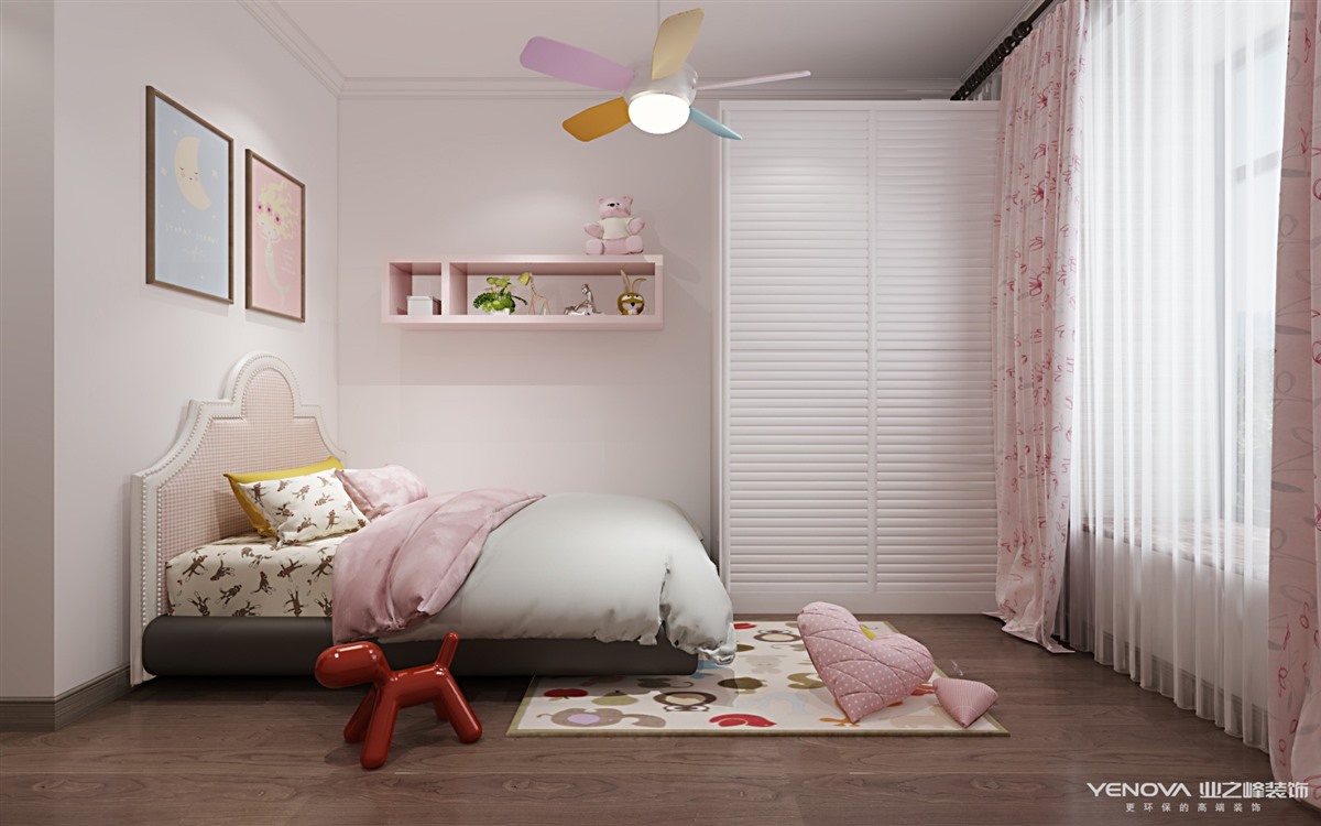 暖色调粉色为主体色,白色作为点缀色,凸显了儿童的个性发展,同时在该空间靠窗配置书桌、衣柜,兼顾学习、储物与视力健康。