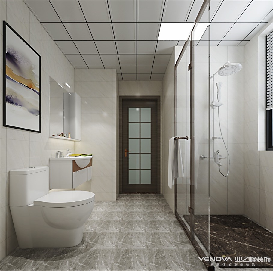 卫浴空间使用当下流行的爵士白纹理瓷砖展现低调奢华,悬挂式浴室柜展现了把简约进行到底。