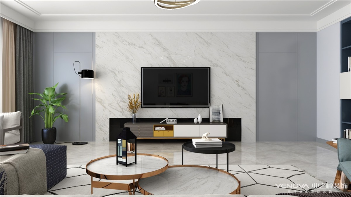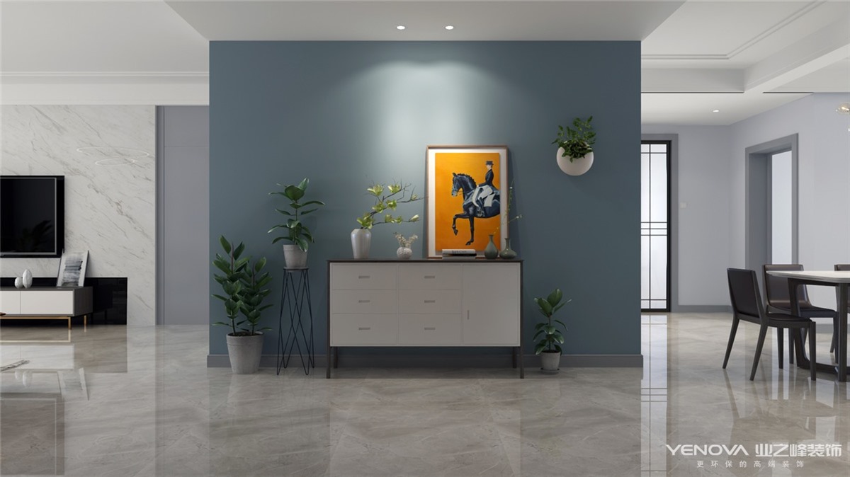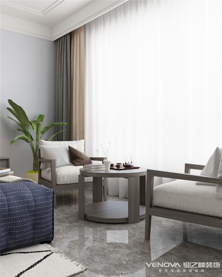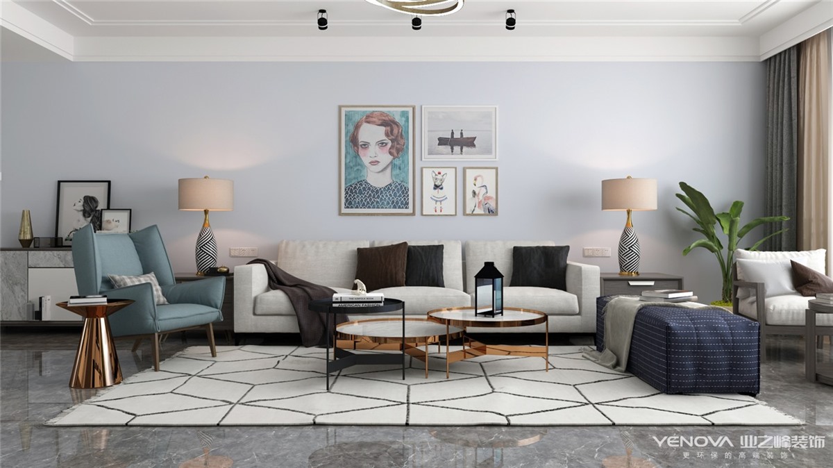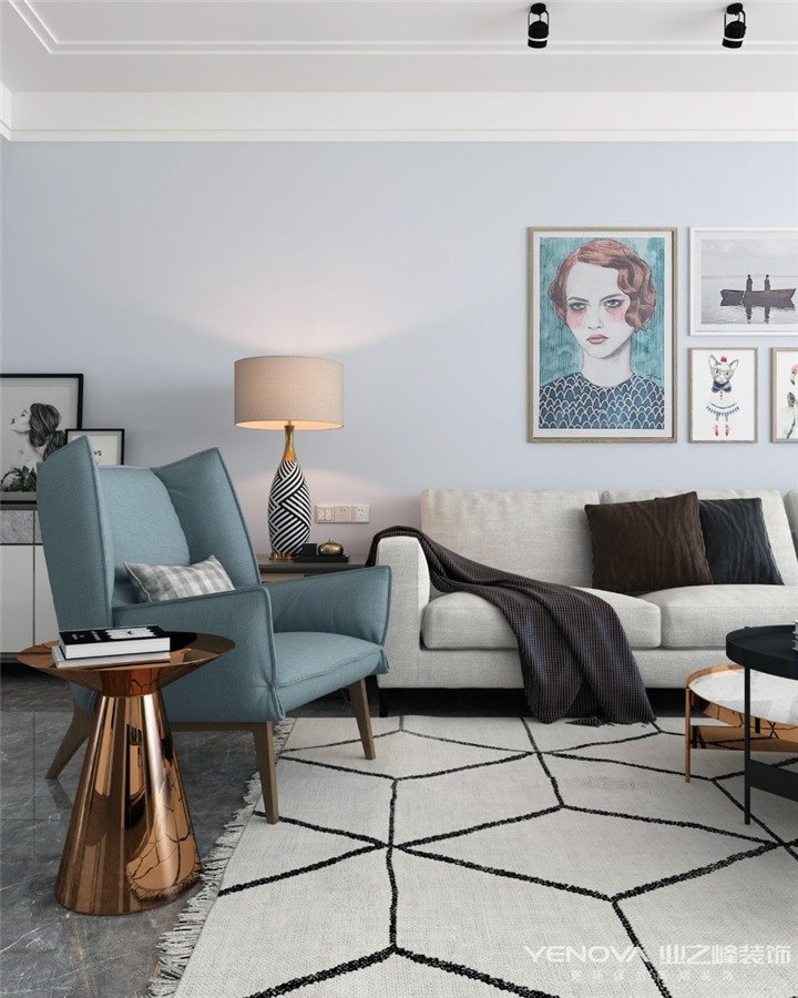 本方案在顶、墙面,用线条来区分点缀。家具设计上,使用偏浅色的布艺家具,并使用黄色、蓝色等进行点缀。整体简洁、直接、功能化且贴近自然,颇受现在年轻人的喜爱。在家居中,木材是永恒不变的主角,它是北欧风格的灵魂,选用的木材没有刻意的花纹,粗旷而简约。未经过油漆的污染,让人进一步的与大自然亲近。