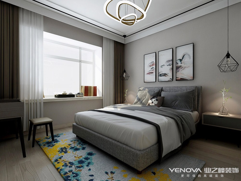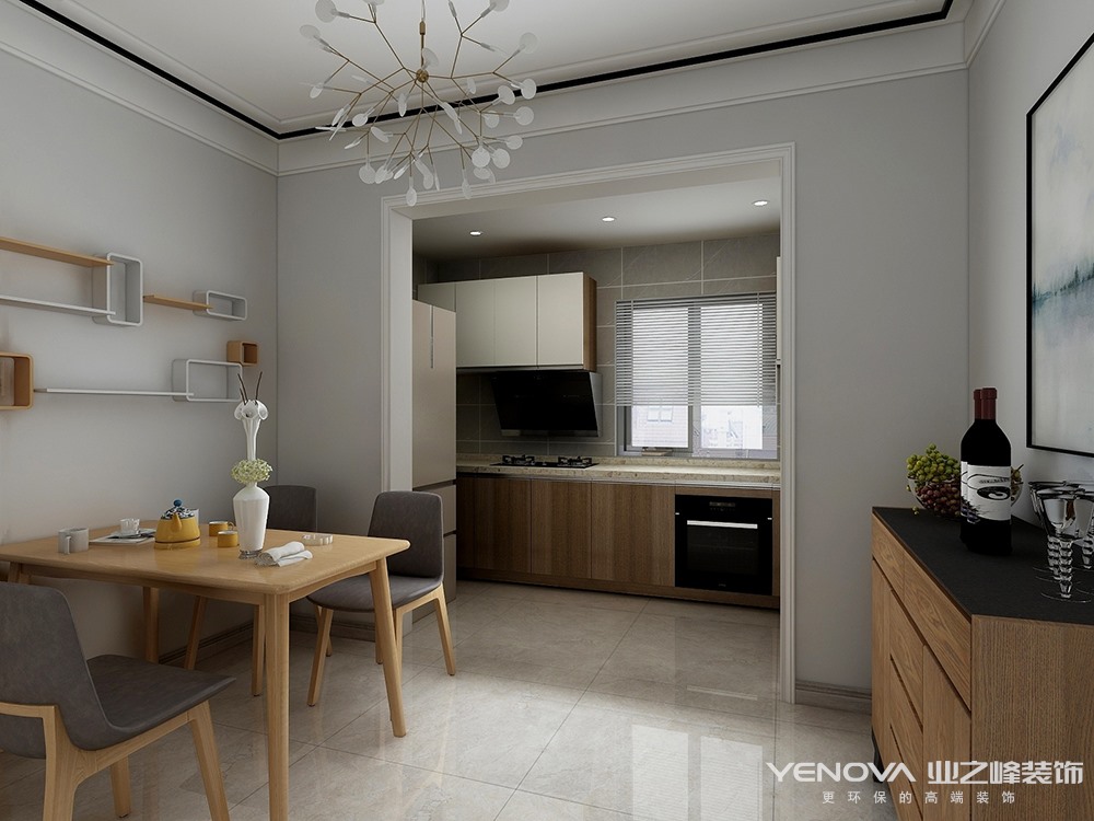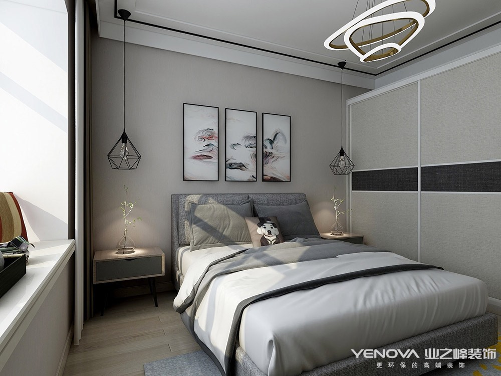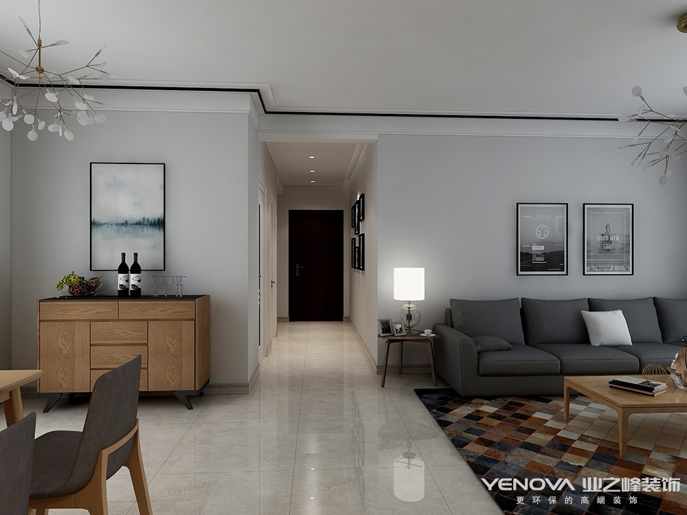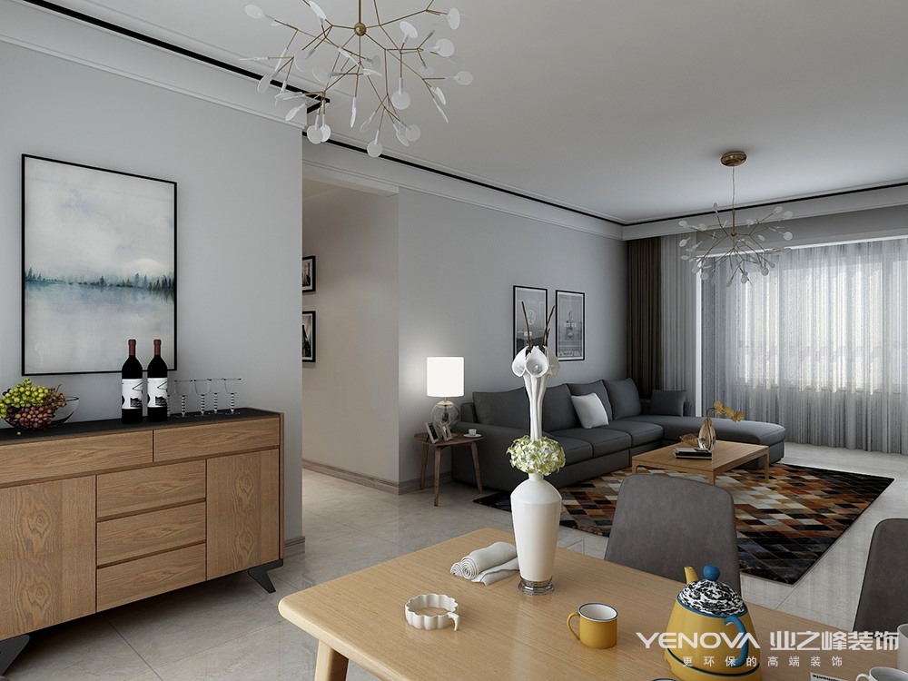本设计案例中材质的选用木色,白色、灰色,局部跳色软装饰品丰富视觉,呼应主题风格。柜体的开放与封闭相结合,让空间美观实用且不显得凌乱。餐厅采用四人座椅的布置方法,运用长方形桌子配合方形座位,客餐厅的搭配设计上色彩和谐自然,文艺范气息得溢出来。卧室简单而不失温馨,床头定制画意境悠远,木色的床头使人心情舒畅,爱人相拥而眠耳鬓厮磨甜蜜温馨。
