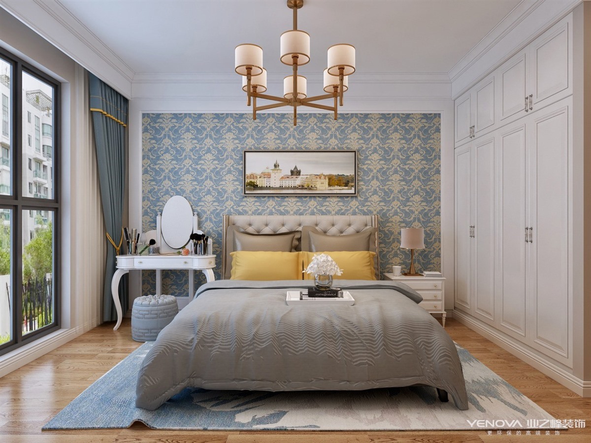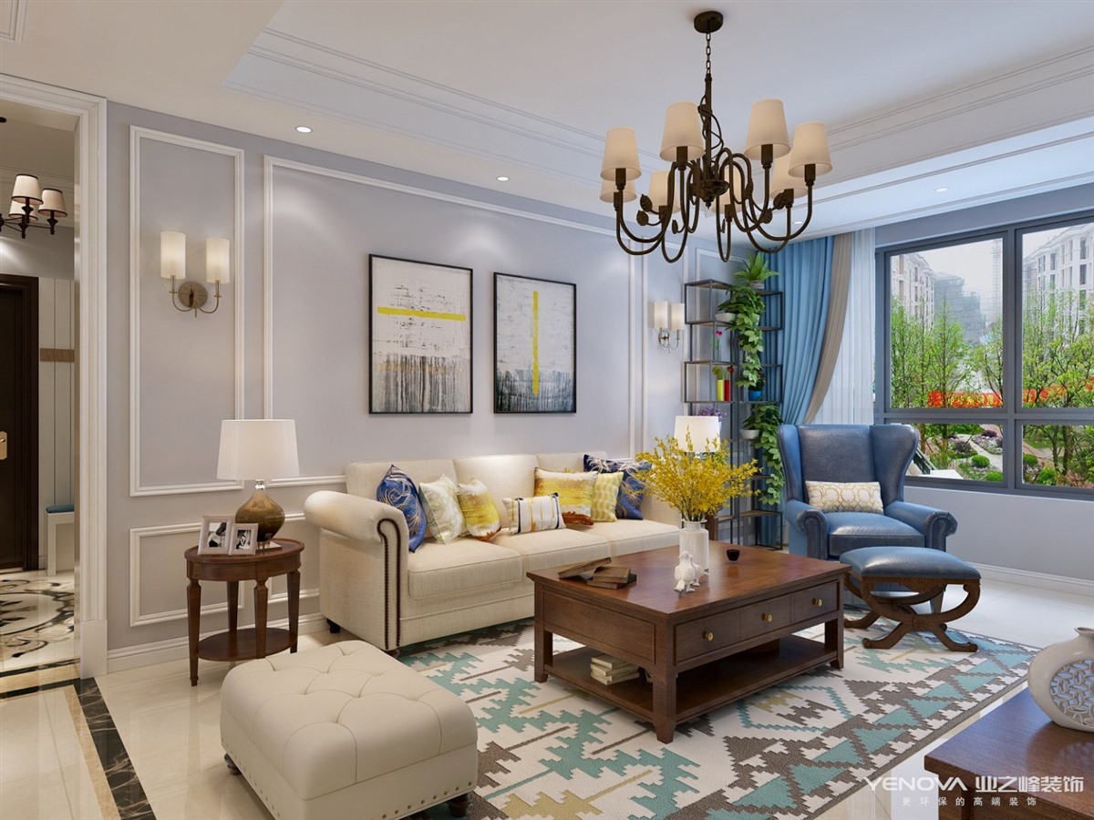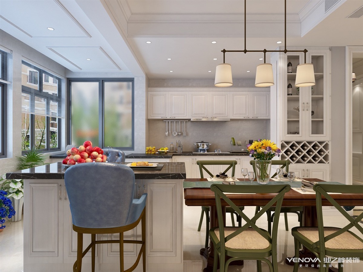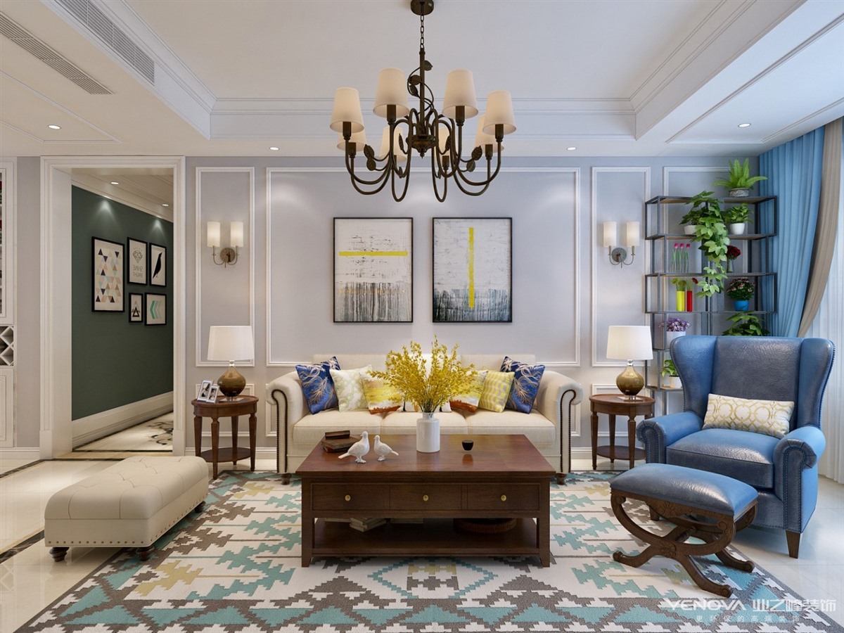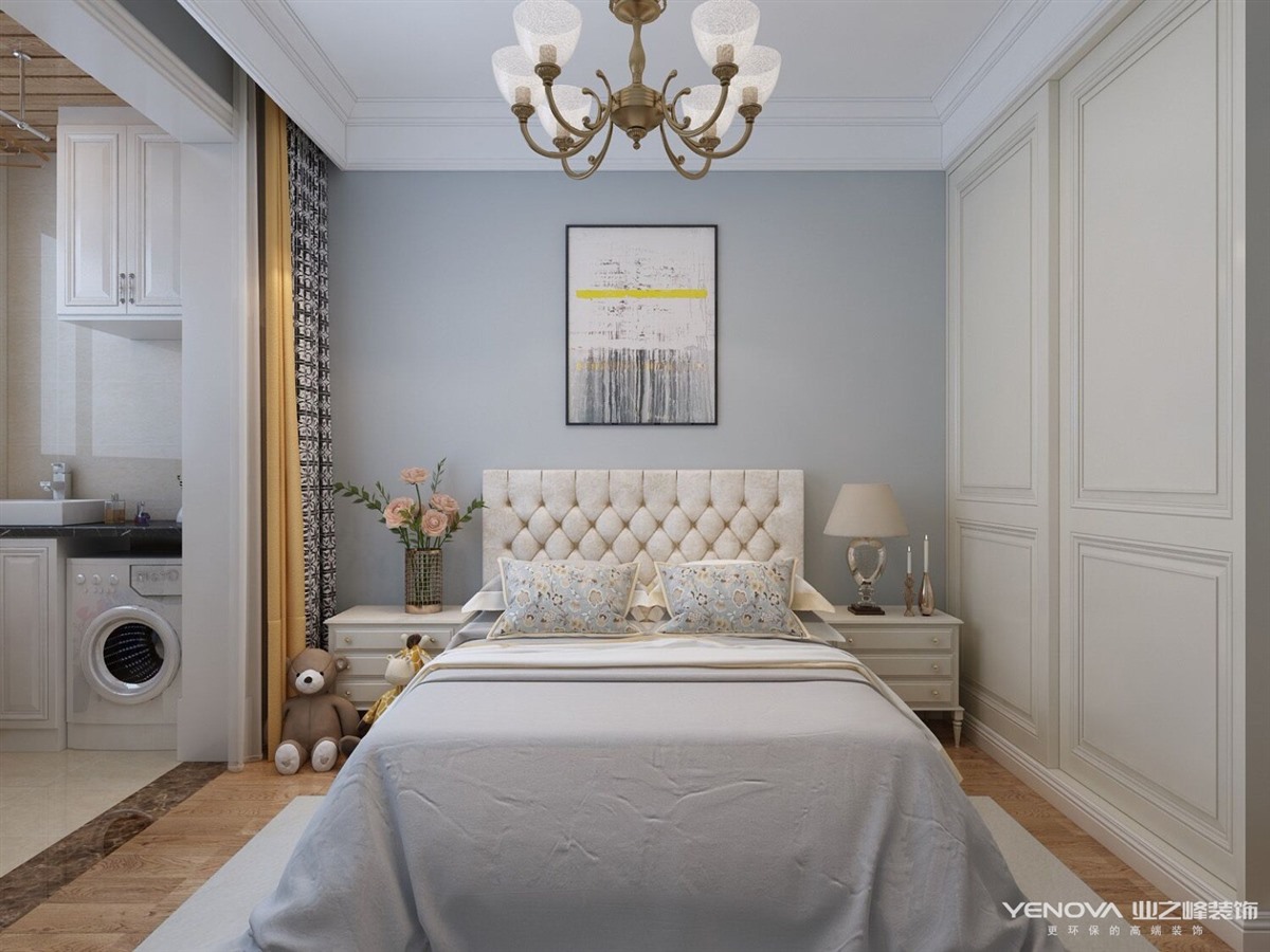 本案定位于美式风格,业主比较年轻喜欢整体风格加入些北欧元素,整体色调以灰蓝为主,以舒适为主强调自然和谐的居住环境。经典美式布艺沙发,搭配原木茶几,体现美式休闲 轻松的氛围。餐厅和厨房拆改较大,业主比较喜欢开敞大视野空间,厨房做了开敞式设计,餐厅居中处做了岛台,满足了业主家庭聚会的愿望。主卧室和衣帽间,主卧在光源使用上极其简练,大面积的白色衣柜,搭配柔柔的灯光带来满满的暖意,步入式衣帽间大大增加了房间的收纳功能。