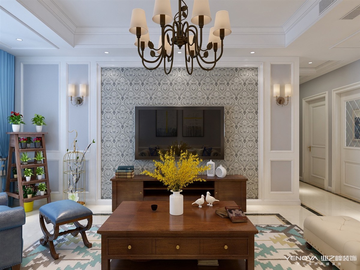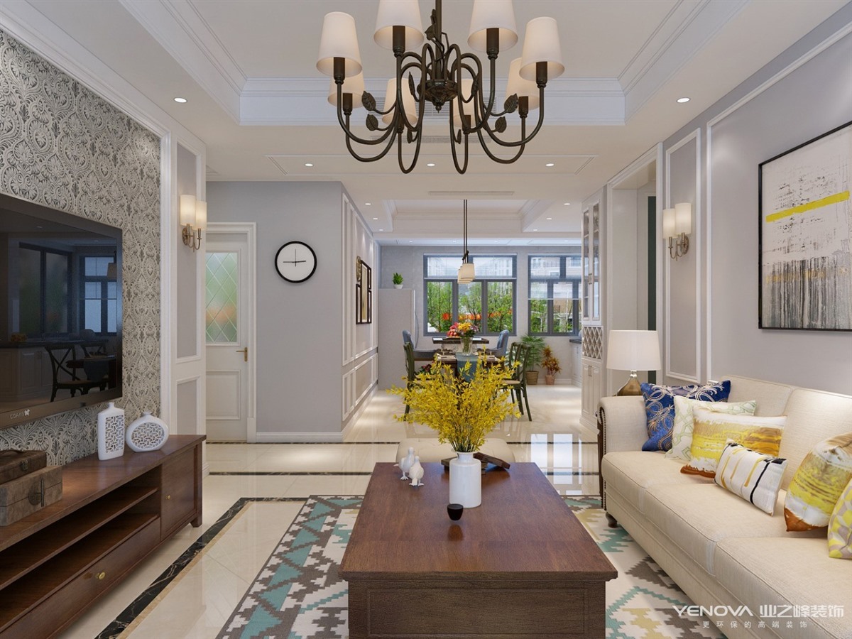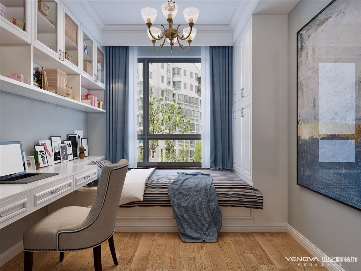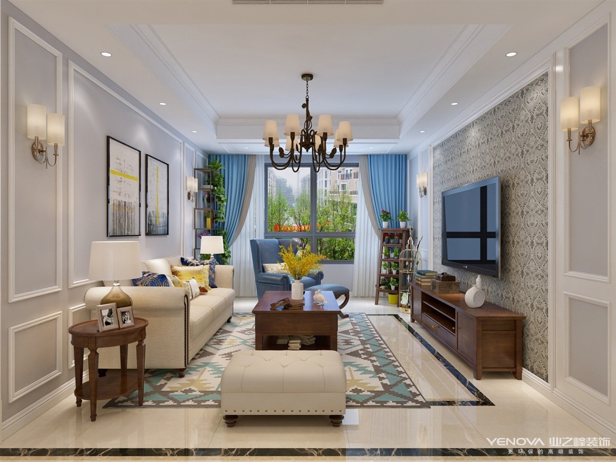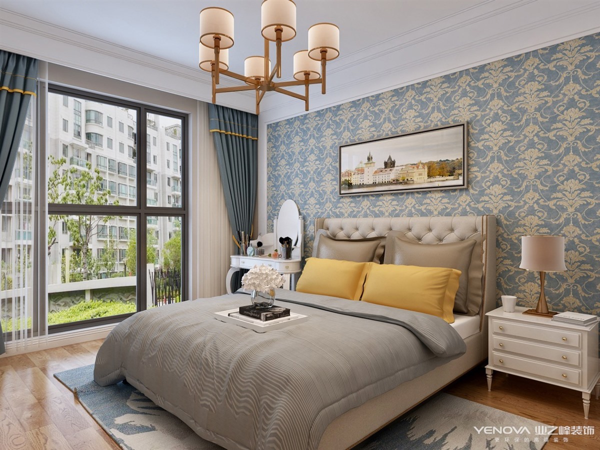 本案定位于美式风格,业主比较年轻喜欢整体风格加入些北欧元素,整体色调以灰蓝为主,以舒适为主强调自然和谐的居住环境。经典美式布艺沙发,搭配原木茶几,体现美式休闲 轻松的氛围。餐厅和厨房拆改较大,业主比较喜欢开敞大视野空间,厨房做了开敞式设计,餐厅居中处做了岛台,满足了业主家庭聚会的愿望。主卧室和衣帽间,主卧在光源使用上极其简练,大面积的白色衣柜,搭配柔柔的灯光带来满满的暖意,步入式衣帽间大大增加了房间的收纳功能。