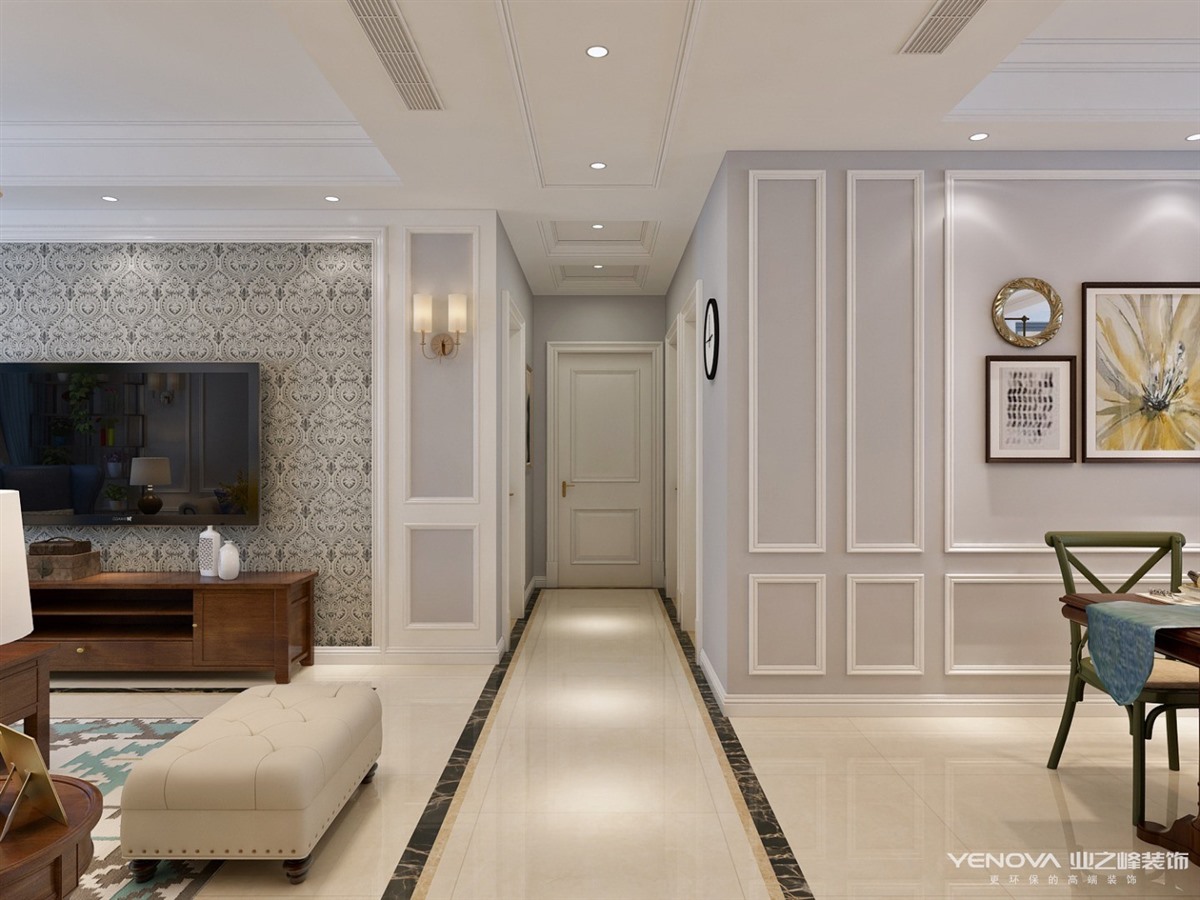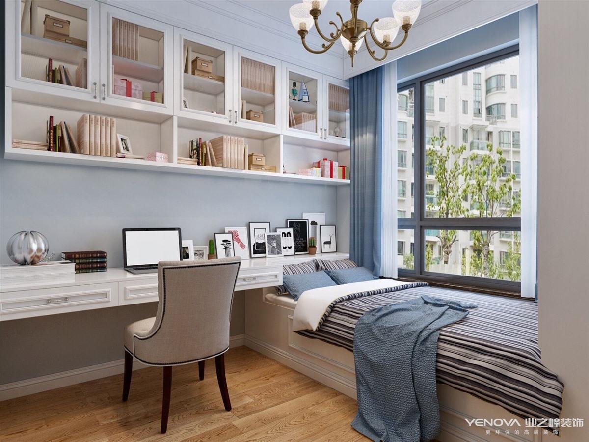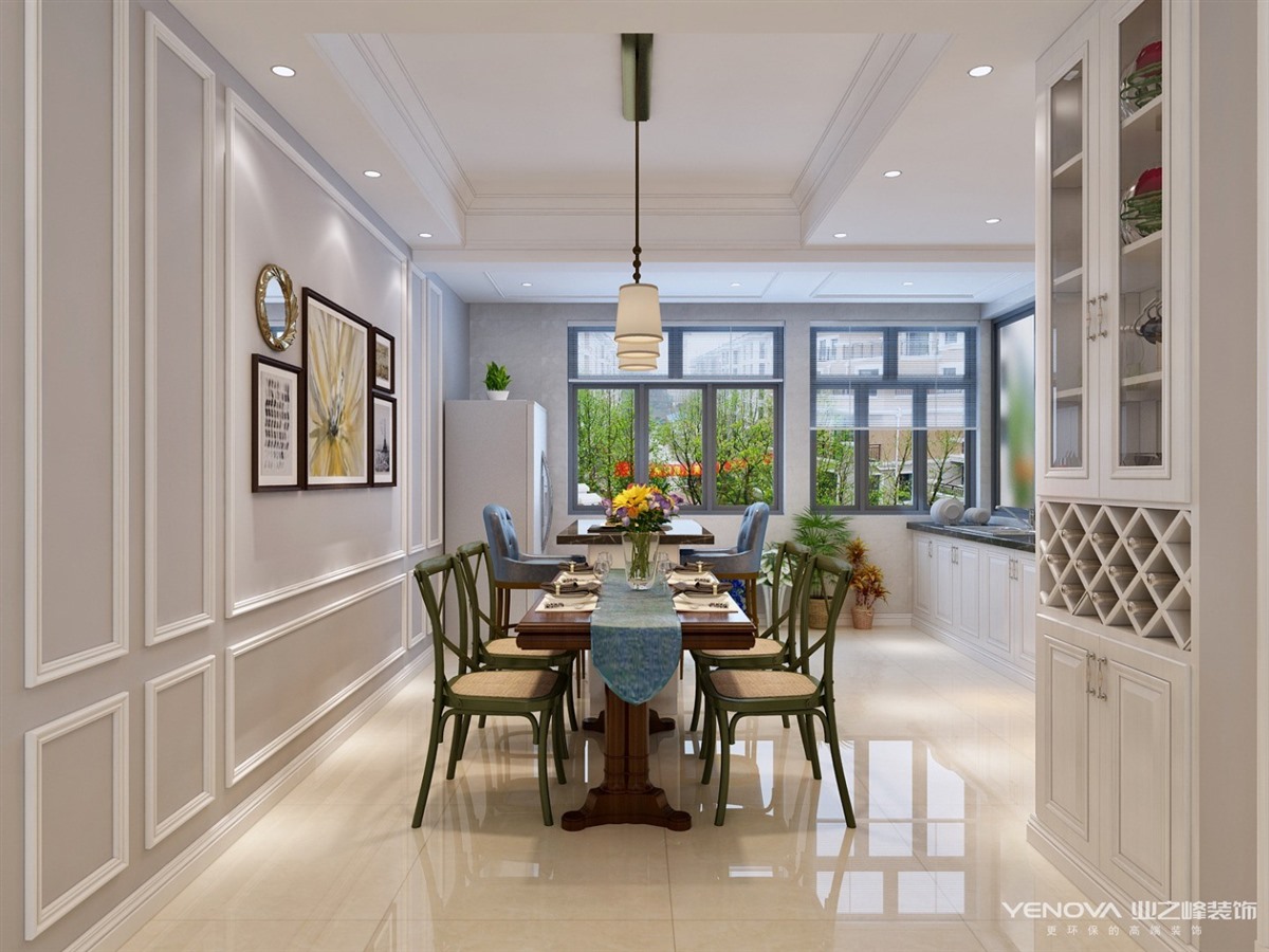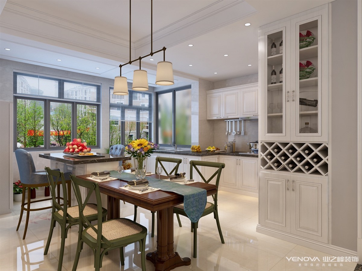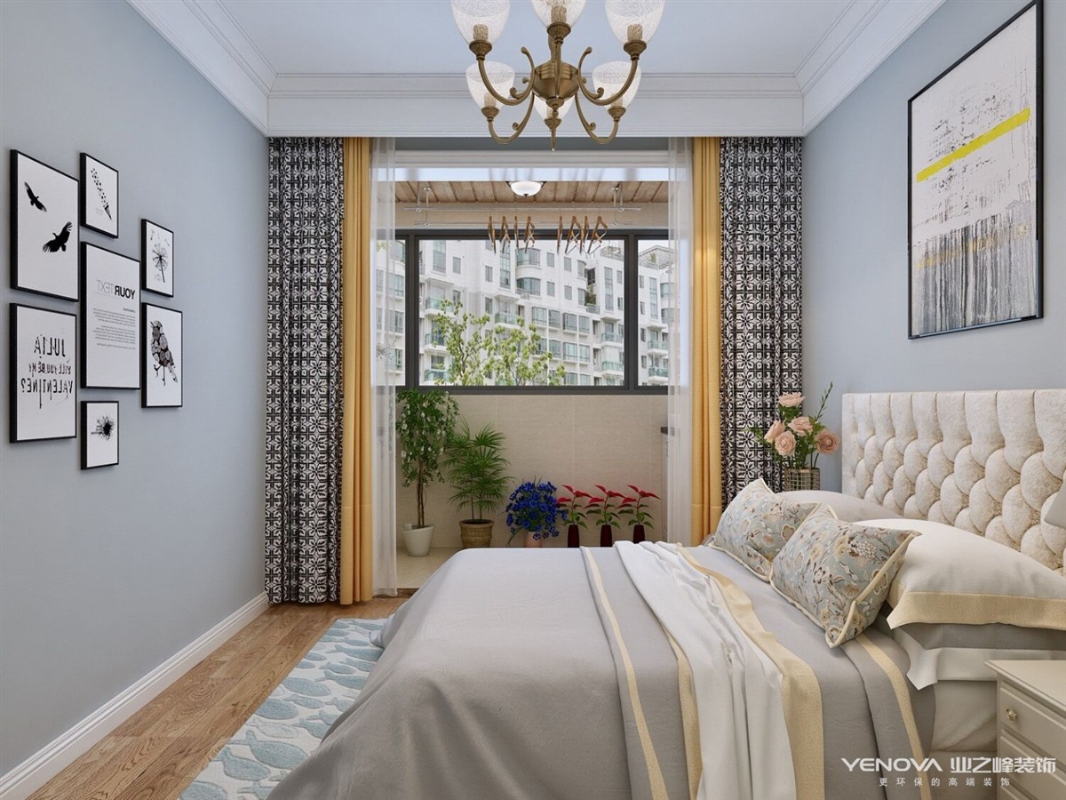 本案定位于美式风格,业主比较年轻喜欢整体风格加入些北欧元素,整体色调以灰蓝为主,以舒适为主强调自然和谐的居住环境。经典美式布艺沙发,搭配原木茶几,体现美式休闲 轻松的氛围。餐厅和厨房拆改较大,业主比较喜欢开敞大视野空间,厨房做了开敞式设计,餐厅居中处做了岛台,满足了业主家庭聚会的愿望。主卧室和衣帽间,主卧在光源使用上极其简练,大面积的白色衣柜,搭配柔柔的灯光带来满满的暖意,步入式衣帽间大大增加了房间的收纳功能。