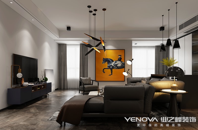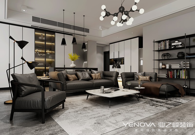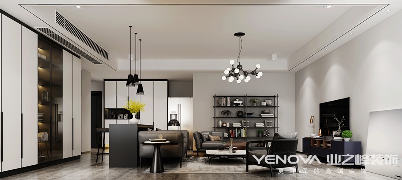 本案客户是一个单身青年,只为打造一个属于自己的独特生活环境,高级灰一直是自己喜欢的,这次终于可以实现自己理想。本案户型改动比较大,在原基础上两房改为一房,客餐厅做整体设计,加上西厨吧台。设计独具个性的后现代风格,表现了一种自在、随意不羁的生活方式。家里一个人居住,餐厅只做简单的吧台形式,整个空间连为整体,隔而不断,视觉上更具延伸效果,房子中每个功能区域间都保证了光线与空气的自由流通,独具个性的现代风格吊灯,让空间多了几分灵动的趣味。
