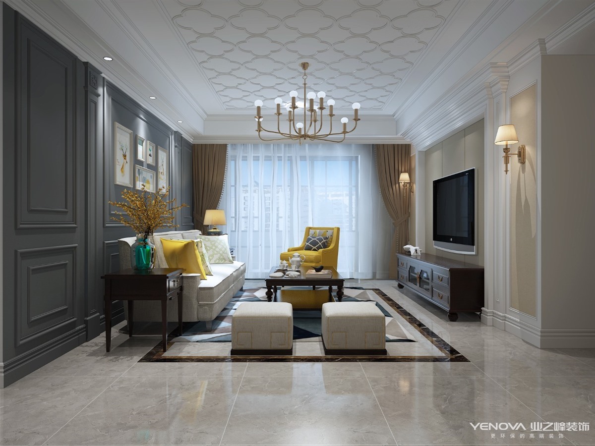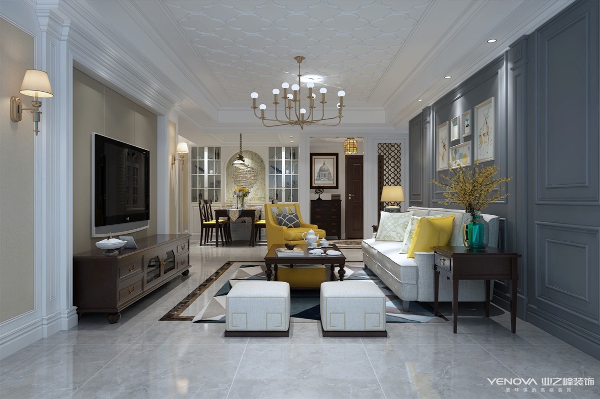 配饰:家具上选用实木深咖色家具,成套的布艺软装,美式铜灯,茶几、地灯、田园装饰画等,软装选用奶咖、明黄、深灰、蓝色,整个氛围简洁大气又不失明亮轻奢。