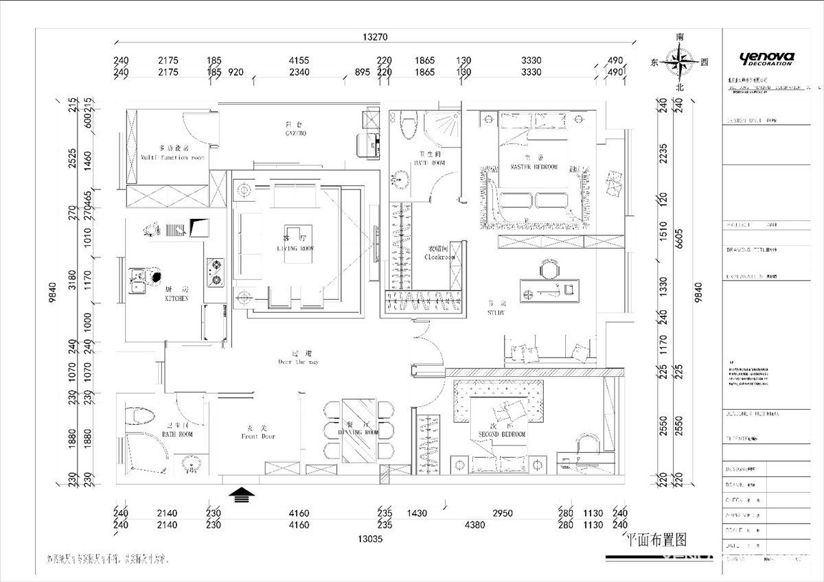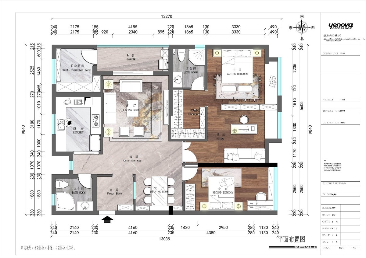 原始户型剖析本户型南北通透,结构不错,通风采光良好,我们需要做的是让功能更加完整,色彩软装搭配舒服。该户型三室两厅一厨两卫,一杂物间。房屋有以下问题:厨房门洞小采光不好,储物室开门方向破坏了电视背景墙,让中轴线偏移。这么好的户型却没有门厅。餐厅的功能区域占地面积略显浪费。所以我做了以下改造。设计亮点:1入户门处增加了门厅,加强厅感。2拆掉现有厨房门、加强采光。3由于业主只需要两间房,所以做了一间主卧大套房,集卫生间、书房、衣帽间、主卧卧室休息功能为一体。4通过墙面地面处理,让客餐厅完整,统一又有明显功能划分。5修改了储物间门门方向,从阳台进入。让电视背景墙完整。